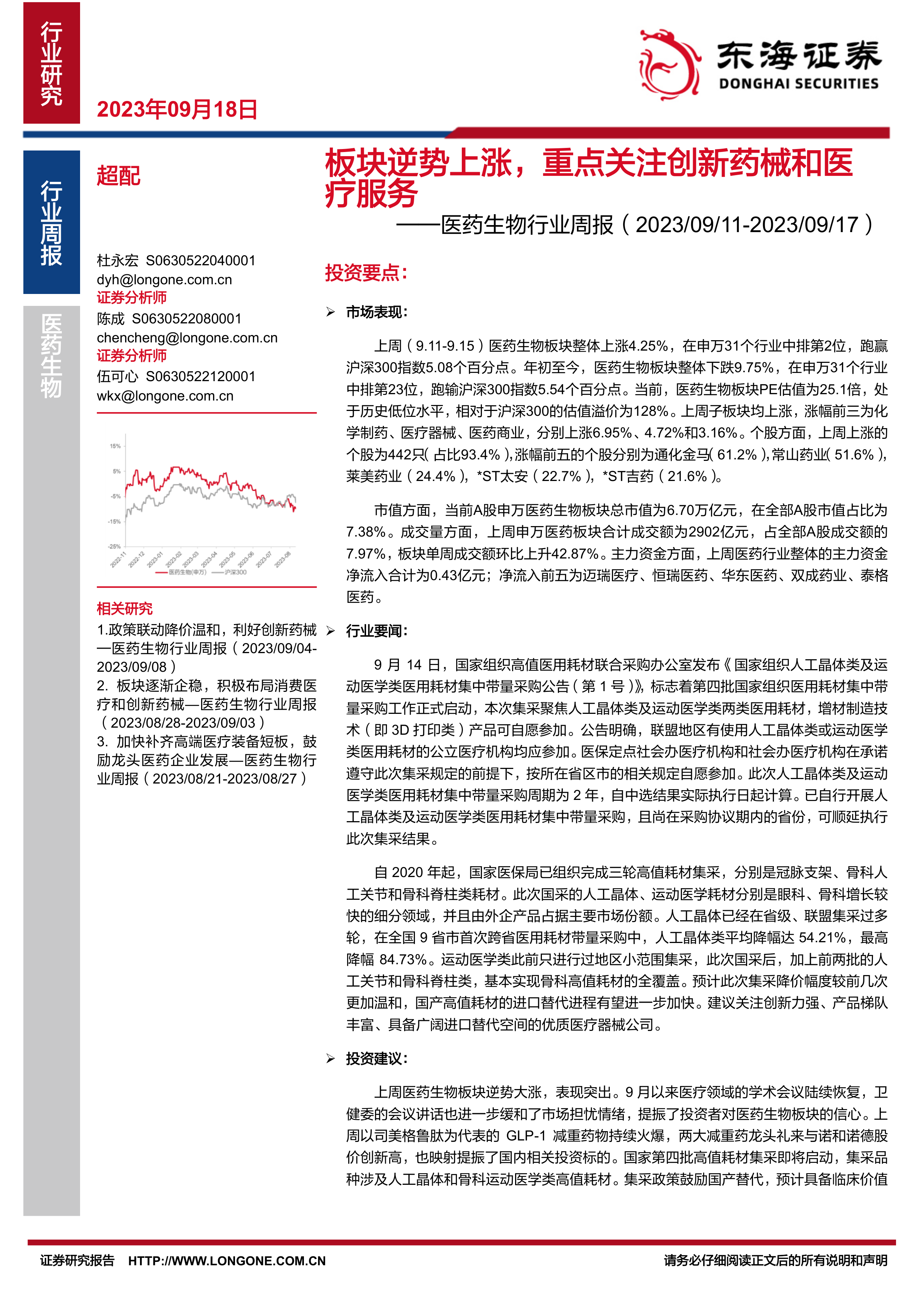 上周医药生物板块逆势大涨,表现突出。9月以来医疗领域的学术会议陆续恢复,卫健委的会议讲话也进一步缓和了市场担忧情绪,提振了投资者对医药生物板块的信心。上周以司美格鲁肽为代表的GLP-1减重药物持续火爆,两大减重药龙头礼来与诺和诺德股价创新高,也映射提振了国内相关投资标的。国家第四批高值耗材集采即将启动,集采品种涉及人工晶体和骨科运动医学类高值耗材。集采政策鼓励国产替代,预计具备临床价值的国产创新器械有望实现快速放量。当前医药生物板块估值仍处于多重底部区间,投资价值显著,建议关注创新药、特色器械、服务外包、民营医院、连锁药店、二类疫苗等细分板块及个股。