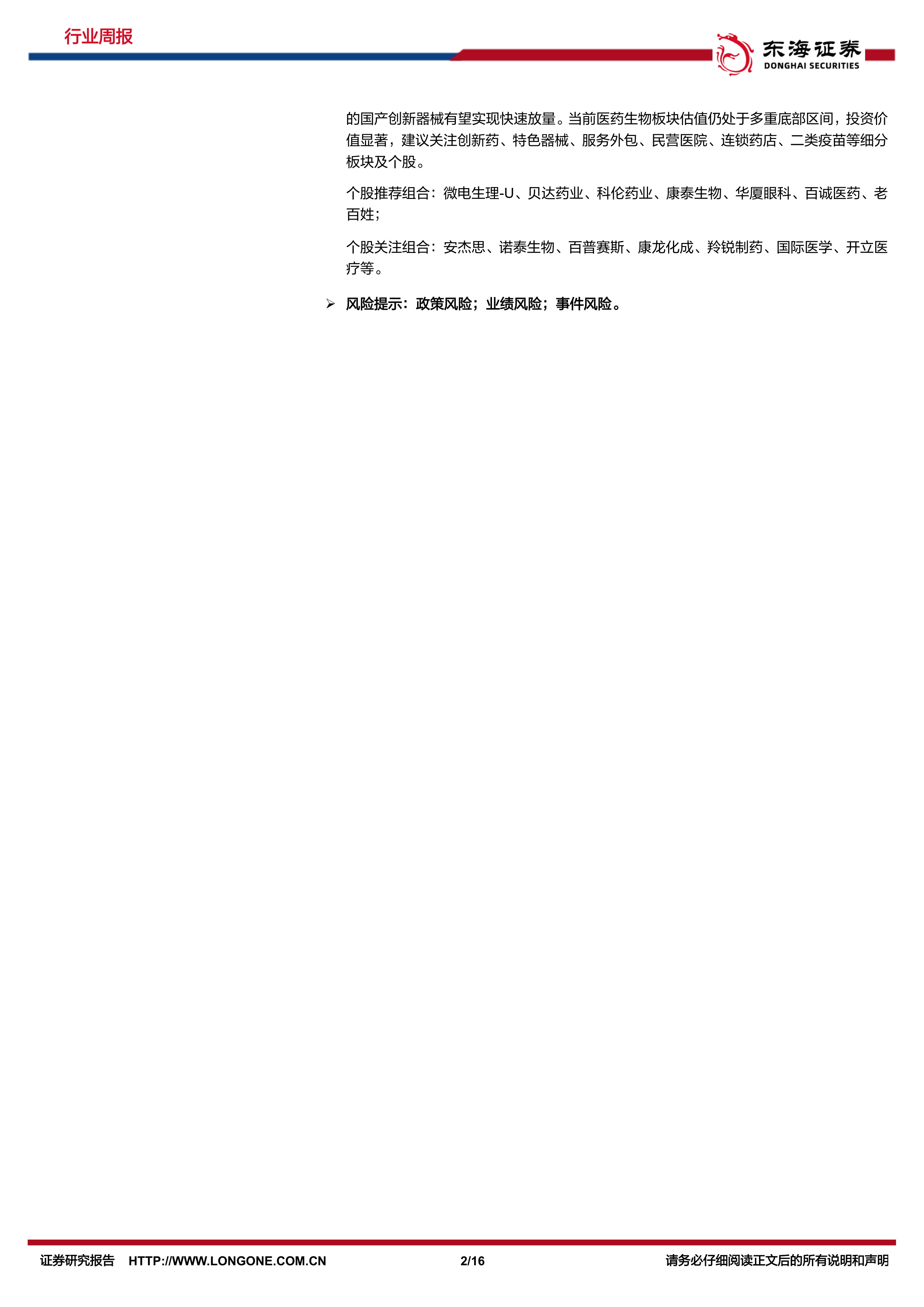 报告最后给出了投资建议,建议关注创新药、特色器械、服务外包、民营医院、连锁药店、二类疫苗等细分板块及个股,并列出了具体的个股推荐和关注组合。 同时,报告也明确指出了投资风险,包括政策风险、业绩风险和事件风险,提醒投资者谨慎投资。
