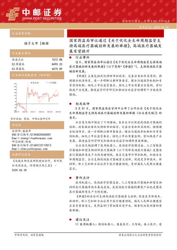 本报告的核心观点是:国家药监局审议通过的《关于优化全生命周期监管支持高端医疗器械创新发展的举措》(以下简称“《举措》”)将大力推动中国高端医疗器械产业发展。该政策的十项具体措施将优化审批流程,完善监管体系,从而促进更多新技术、新材料、新工艺和新方法应用于医疗健康领域,最终满足人民群众日益增长的健康需求。 报告建议关注医用机器人、高端医学影像设备、人工智能医疗器械和新型生物材料医疗器械等四个细分领域,并提示了政策风险、市场竞争加剧风险以及产品销售及研发进度不及预期等潜在风险。