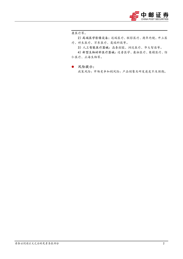 报告建议投资者关注四个与《举措》密切相关的细分领域:医用机器人、高端医学影像设备、人工智能医疗器械和新型生物材料医疗器械。 同时,报告也明确指出潜在的风险,包括政策风险(政策变化可能影响行业发展)、市场竞争加剧风险(市场竞争加剧可能导致企业盈利能力下降)以及产品销售及研发进度不及预期风险(产品销售不及预期或研发进度延误可能影响企业业绩)。投资者需谨慎评估这些风险,做出理性投资决策。