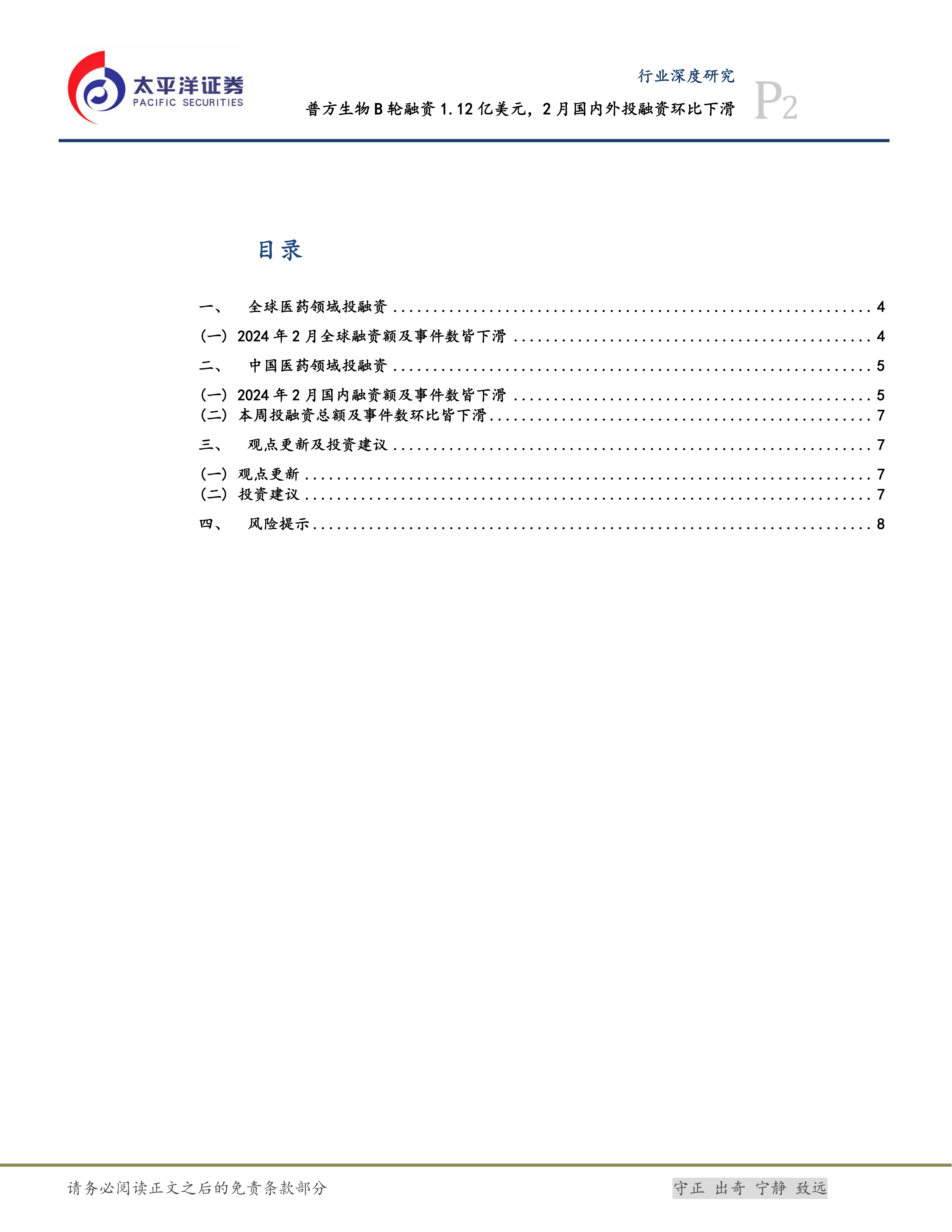 本报告的核心观点是:2024年2月全球及中国医药领域的投融资活动均出现下滑,但海外市场复苏迹象显现,国内市场仍处于调整期。 普方生物B轮融资1.12亿美元成为2月国内医疗健康领域融资额最高的事件。 报告建议关注具备国际竞争优势的CDMO龙头企业、仿制药CXO以及具有发展潜力的细分领域(如减肥药、阿尔茨海默症、ADC和AI)。