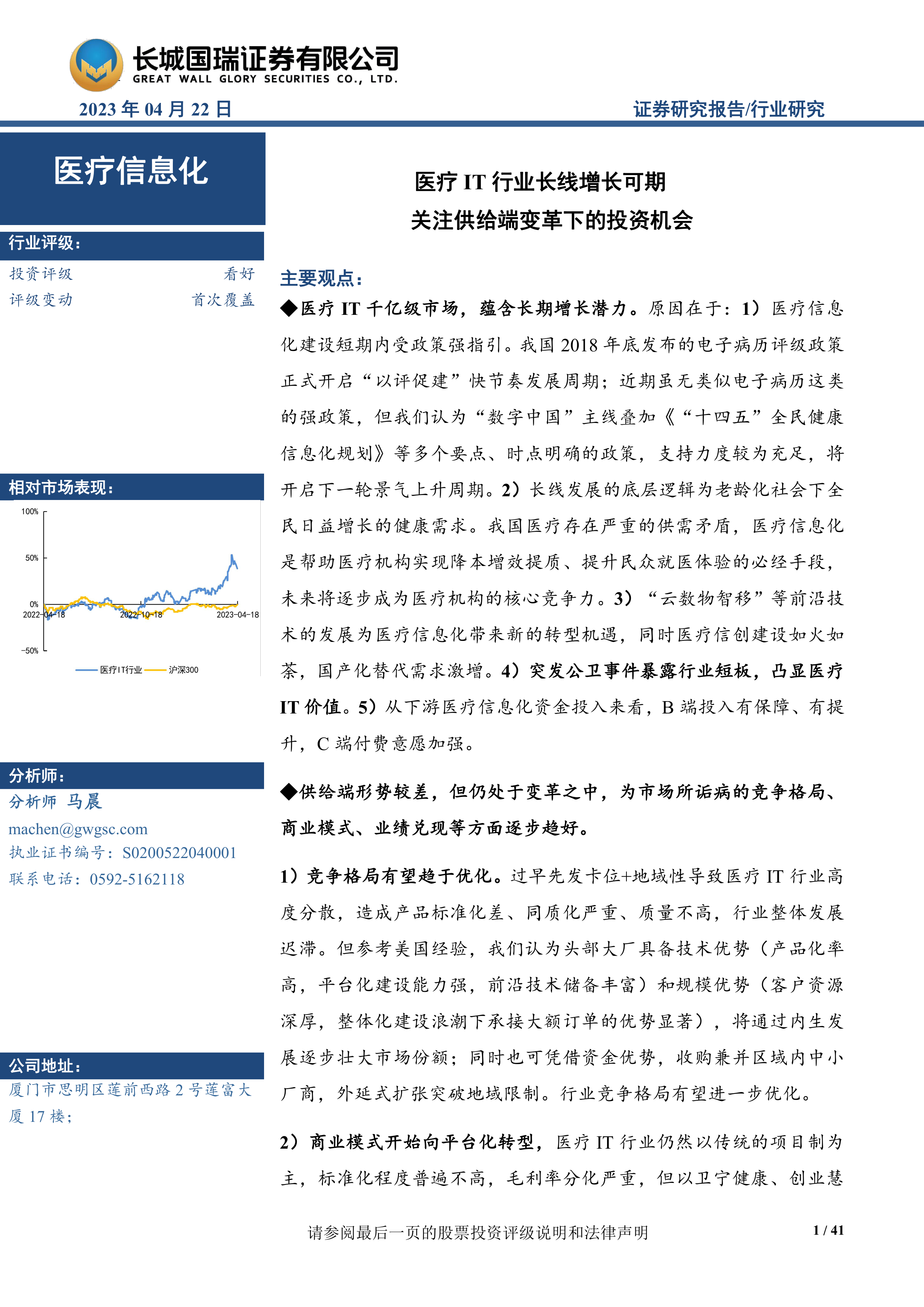 本报告的核心观点是:中国医疗IT行业拥有千亿级市场规模,长期增长潜力巨大,但供给端存在诸多挑战。短期内,政策强力指引将推动行业发展,开启新一轮景气上升周期;长期来看,老龄化社会日益增长的健康需求以及前沿技术的应用将持续驱动行业增长。然而,行业集中度低、商业模式落后、业绩兑现能力不足等问题也需要关注。报告建议投资者关注产品线完整度高、在细分领域具有竞争优势的头部企业,并密切关注行业供需变化和政策落地情况。