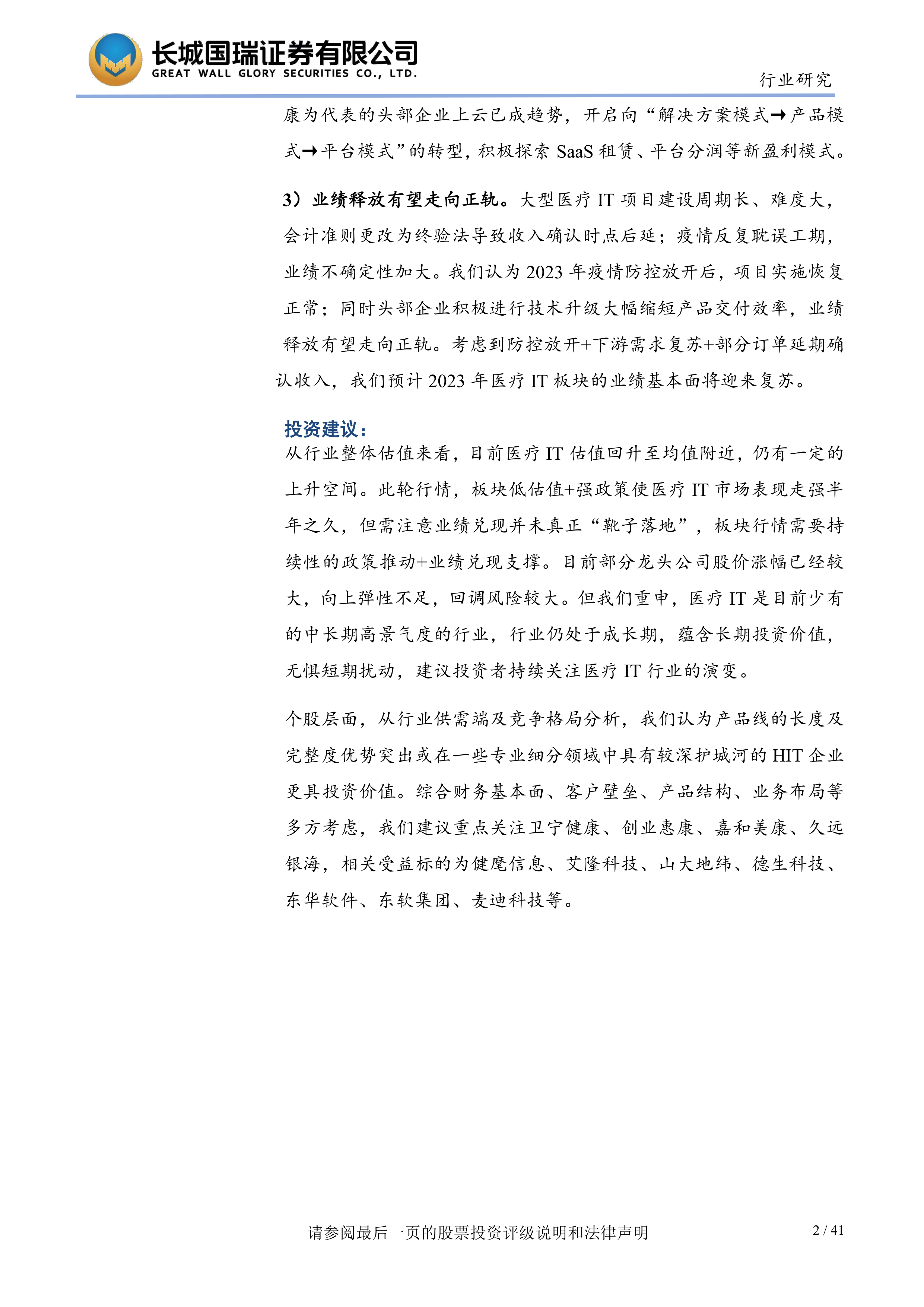 个股层面,从行业供需端及竞争格局分析,我们认为产品线的长度及完整度优势突出或在一些专业细分领域中具有较深护城河的HIT企业更具投资价值。综合财务基本面、客户壁垒、产品结构、业务布局等多方考虑,我们建议重点关注卫宁健康、创业惠康、嘉和美康、久远银海,相关受益标的为健麾信息、艾隆科技、山大地纬、德生科技、东华软件、东软集团、麦迪科技等。