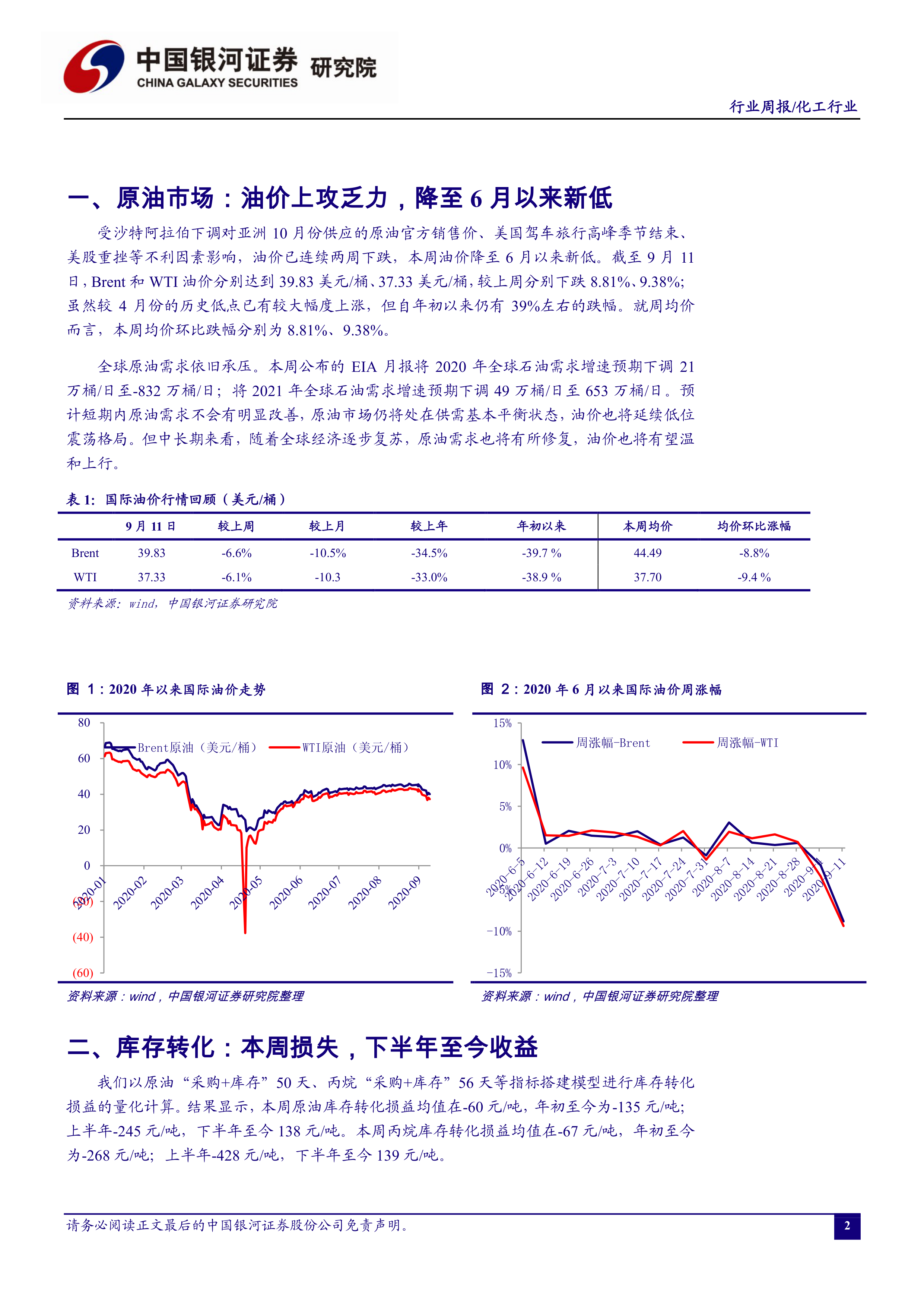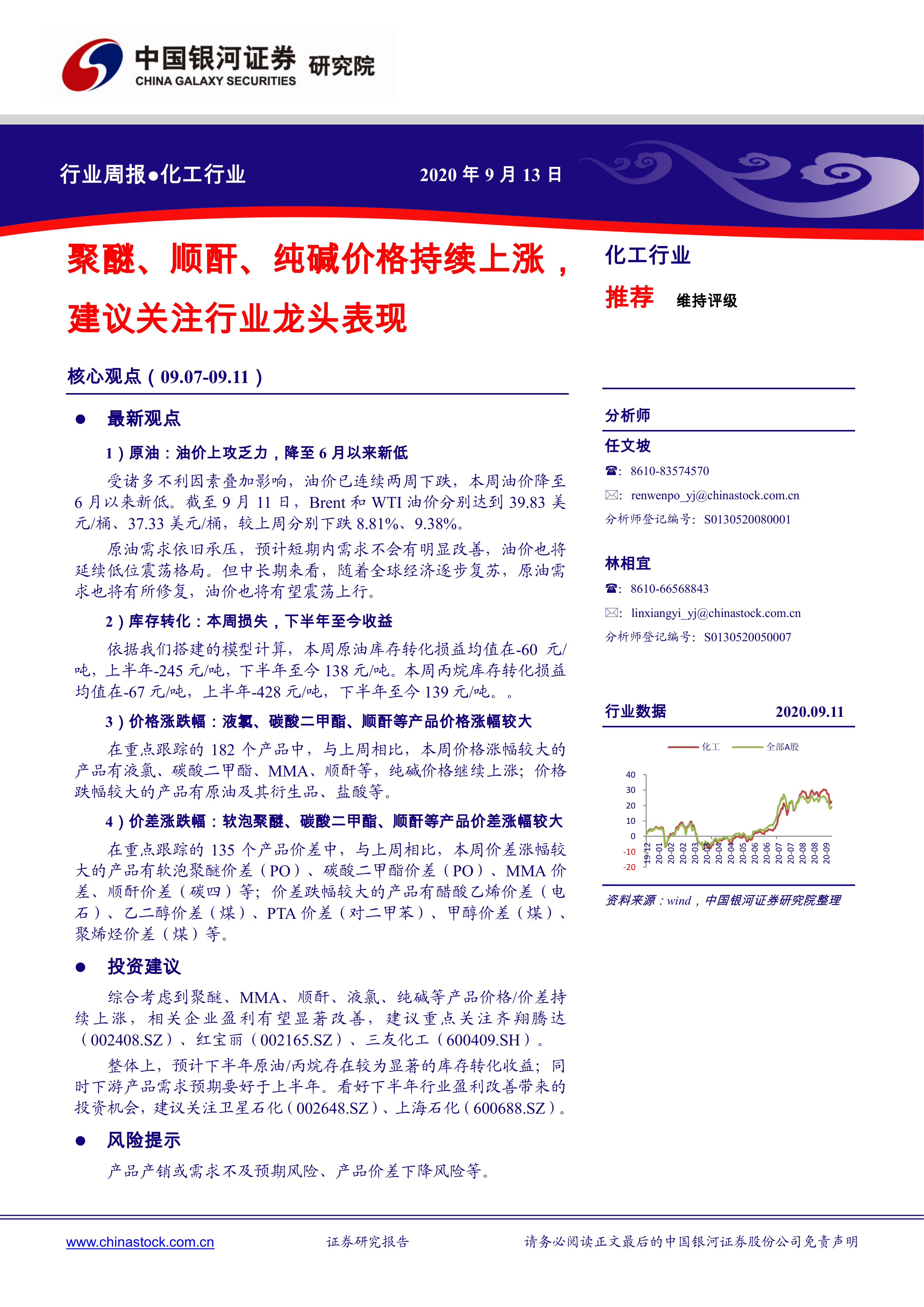 本报告的核心观点是:2020年9月7日至11日,化工行业部分产品价格和价差持续上涨,而原油价格则下跌至6月以来新低。这种市场走势与原油需求承压、库存转化收益以及部分化工产品供需关系变化密切相关。报告建议关注受益于产品价格上涨的相关企业,并看好下半年化工行业盈利改善带来的投资机会。