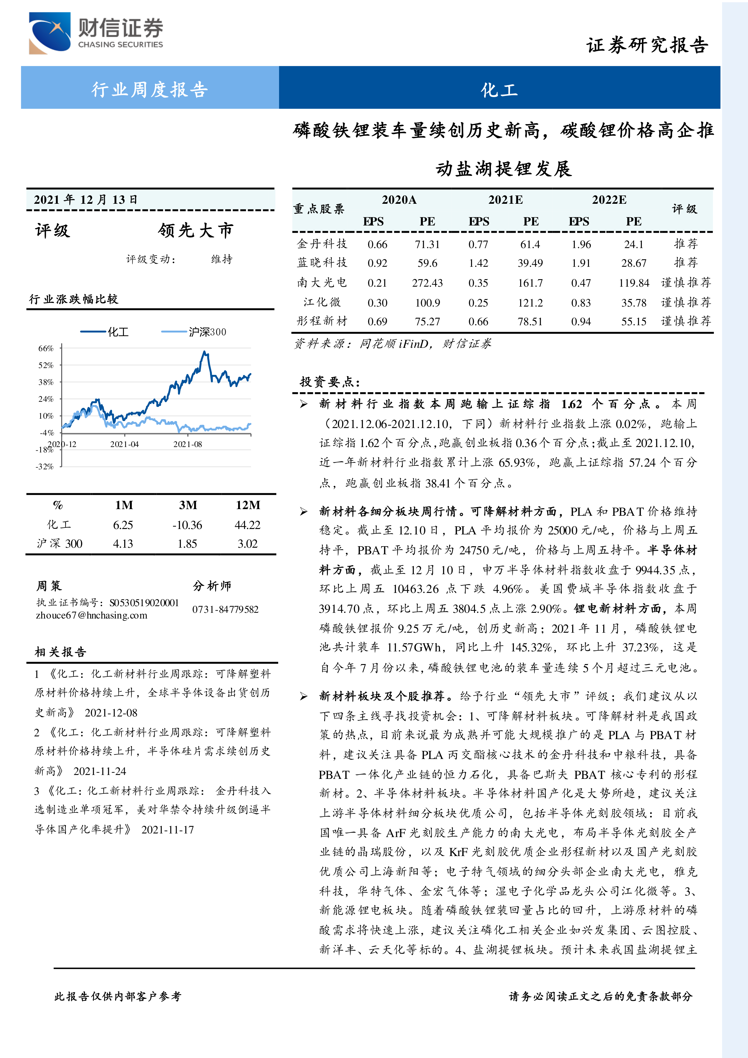 新材料板块及个股推荐。 给予行业“领先大市”评级;我们建议从以下四条主线寻找投资机会: 1、可降解材料板块。可降解材料是我国政策的热点,目前来说最为成熟并可能大规模推广的是 PLA 与 PBAT 材料,建议关注具备 PLA 丙交酯核心技术的金丹科技和中粮科技,具备PBAT 一体化产业链的恒力石化,具备巴斯夫 PBAT 核心专利的彤程新材。 2、半导体材料板块。半导体材料国产化是大势所趋,建议关注上游半导体材料细分板块优质公司,包括半导体光刻胶领域:目前我国唯一具备 ArF 光刻胶生产能力的南大光电,布局半导体光刻胶全产业链的晶瑞股份,以及 KrF 光刻胶优质企业彤程新材以及国产光刻胶优质公司上海新阳等;电子特气领域的细分头部企业南大光电,雅克科技,华特气体、金宏气体等;湿电子化学品龙头公司江化微等。 3、新能源锂电板块。随着磷酸铁锂装回量占比的回升,上游原材料的磷酸需求将快速上涨,建议关注磷化工相关企业如兴发集团、 云图控股、新洋丰、云天化等标的。 4、盐湖提锂板块。预计未来我国盐湖提锂主流的技术是吸附法、膜法和萃取法,从当前时点来看,蓝晓科技的吸附法提锂已经在藏格和锦泰中运用且效果较好,重点推荐蓝晓科技。同时,建议关注膜法标的久吾高科和三达膜,萃取法标的新化股份。