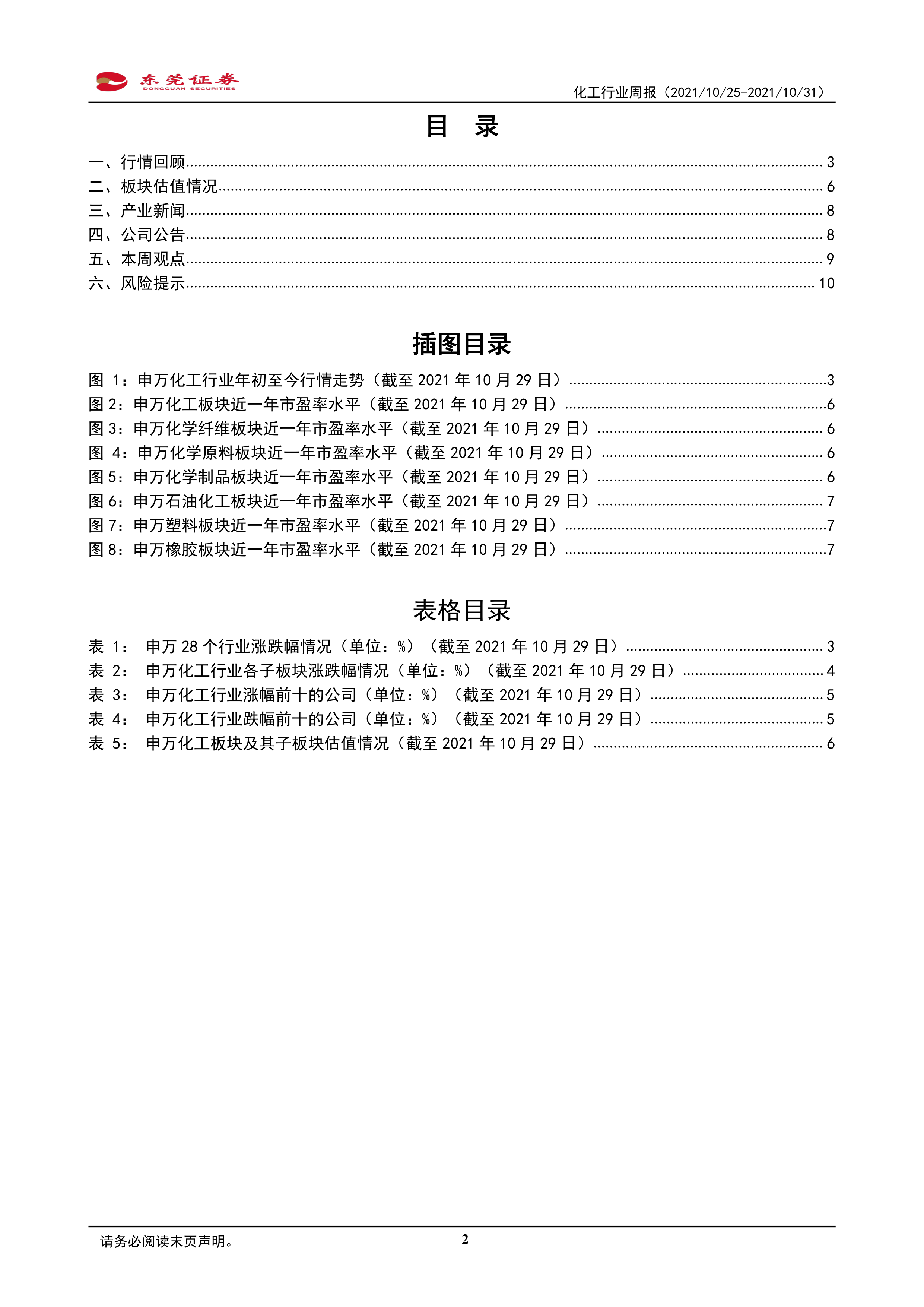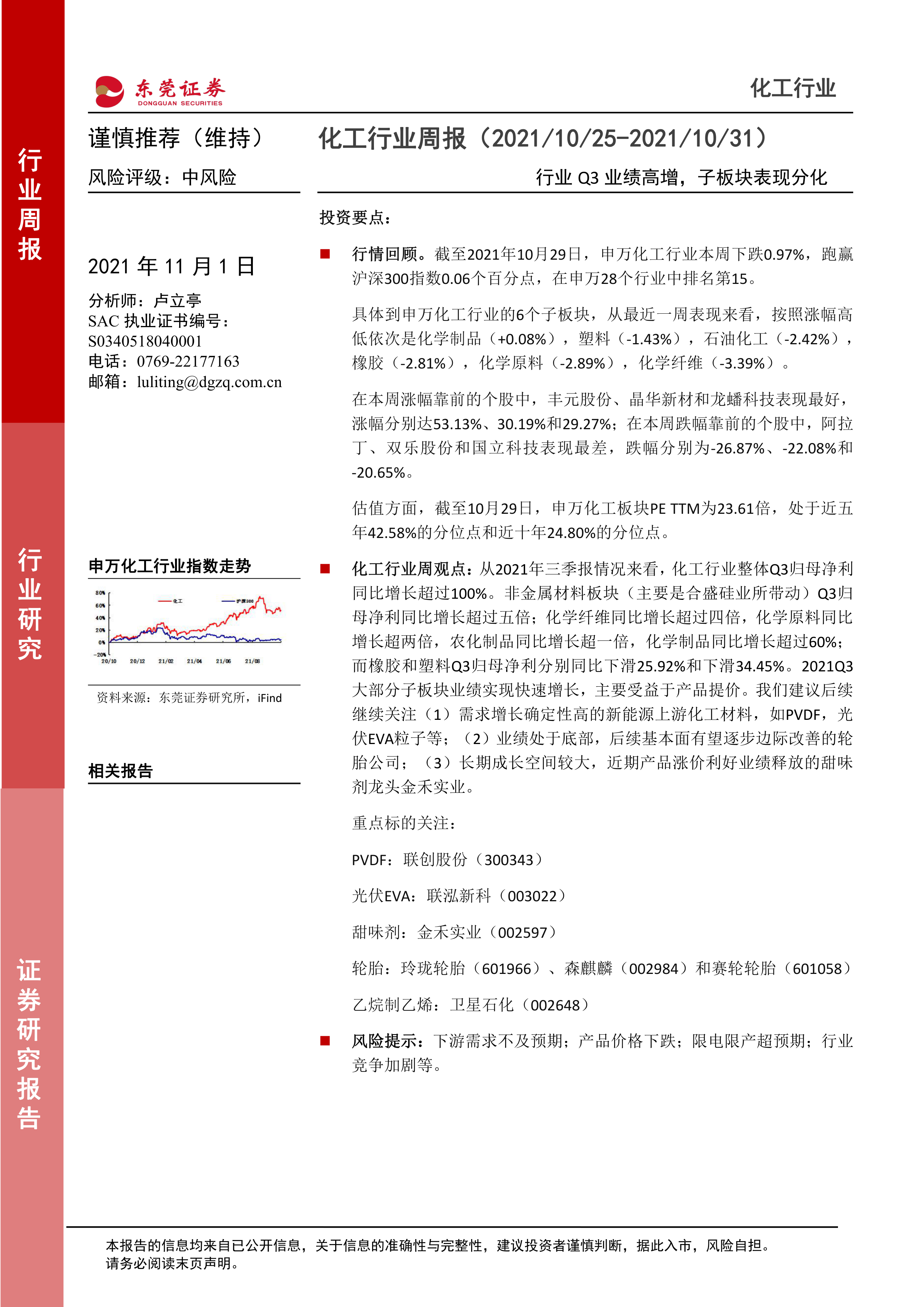 本报告基于公开数据,对2021年10月25日至10月31日期间化工行业市场表现、估值水平、产业新闻、公司公告等方面进行了全面分析。报告指出,化工行业整体业绩高增长,但子板块表现分化显著,部分板块业绩增长强劲,部分板块业绩下滑。报告建议投资者关注新能源上游化工材料、业绩处于底部的轮胎公司以及甜味剂龙头企业,并提示了投资风险,例如下游需求不及预期、产品价格下跌、限电限产超预期以及行业竞争加剧等。 投资者应结合自身风险承受能力和投资目标,谨慎决策。 本报告仅供参考,不构成投资建议。