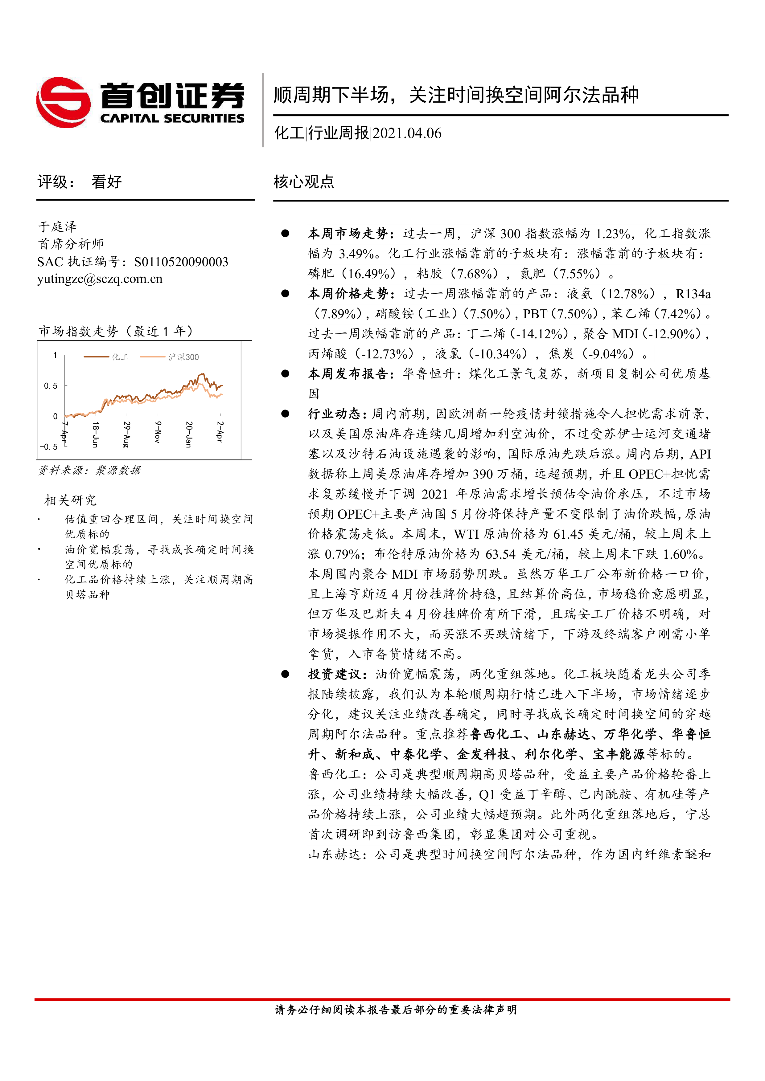 投资建议:油价宽幅震荡,两化重组落地。化工板块随着龙头公司季报陆续披露,我们认为本轮顺周期行情已进入下半场,市场情绪逐步分化,建议关注业绩改善确定,同时寻找成长确定时间换空间的穿越周期阿尔法品种。重点推荐鲁西化工、山东赫达、万华化学、华鲁恒升、新和成、中泰化学、金发科技、利尔化学、宝丰能源等标的。