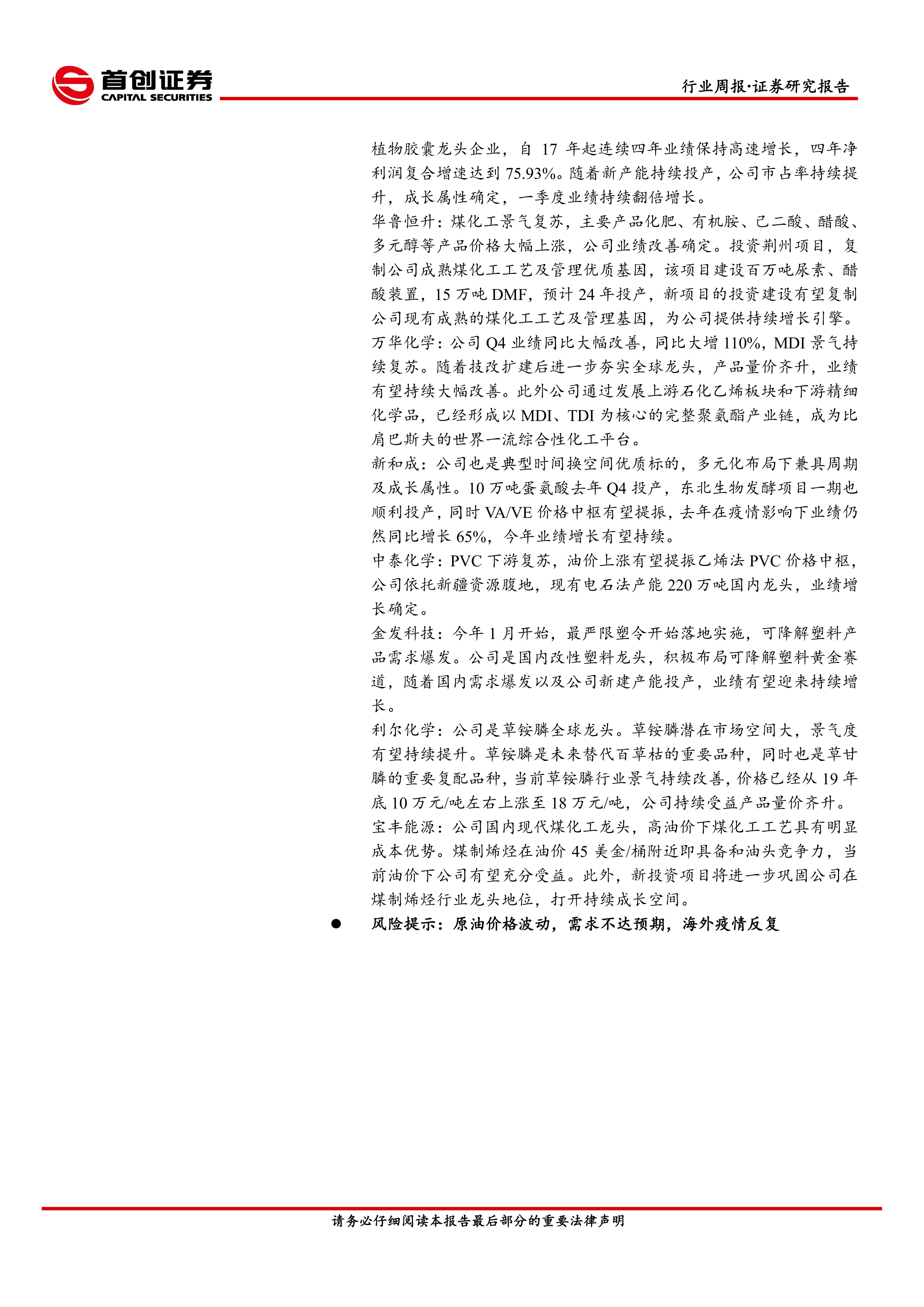 利尔化学:公司是草铵膦全球龙头。草铵膦潜在市场空间大,景气度有望持续提升。草铵膦是未来替代百草枯的重要品种,同时也是草甘膦的重要复配品种,当前草铵膦行业景气持续改善,价格已经从19年底10万元/吨左右上涨至18万元/吨,公司持续受益产品量价齐升。宝丰能源:公司国内现代煤化工龙头,高油价下煤化工工艺具有明显成本优势。煤制烯烃在油价45美金/桶附近即具备和油头竞争力,当前油价下公司有望充分受益。此外,新投资项目将进一步巩固公司在煤制烯烃行业龙头地位,打开持续成长空间。