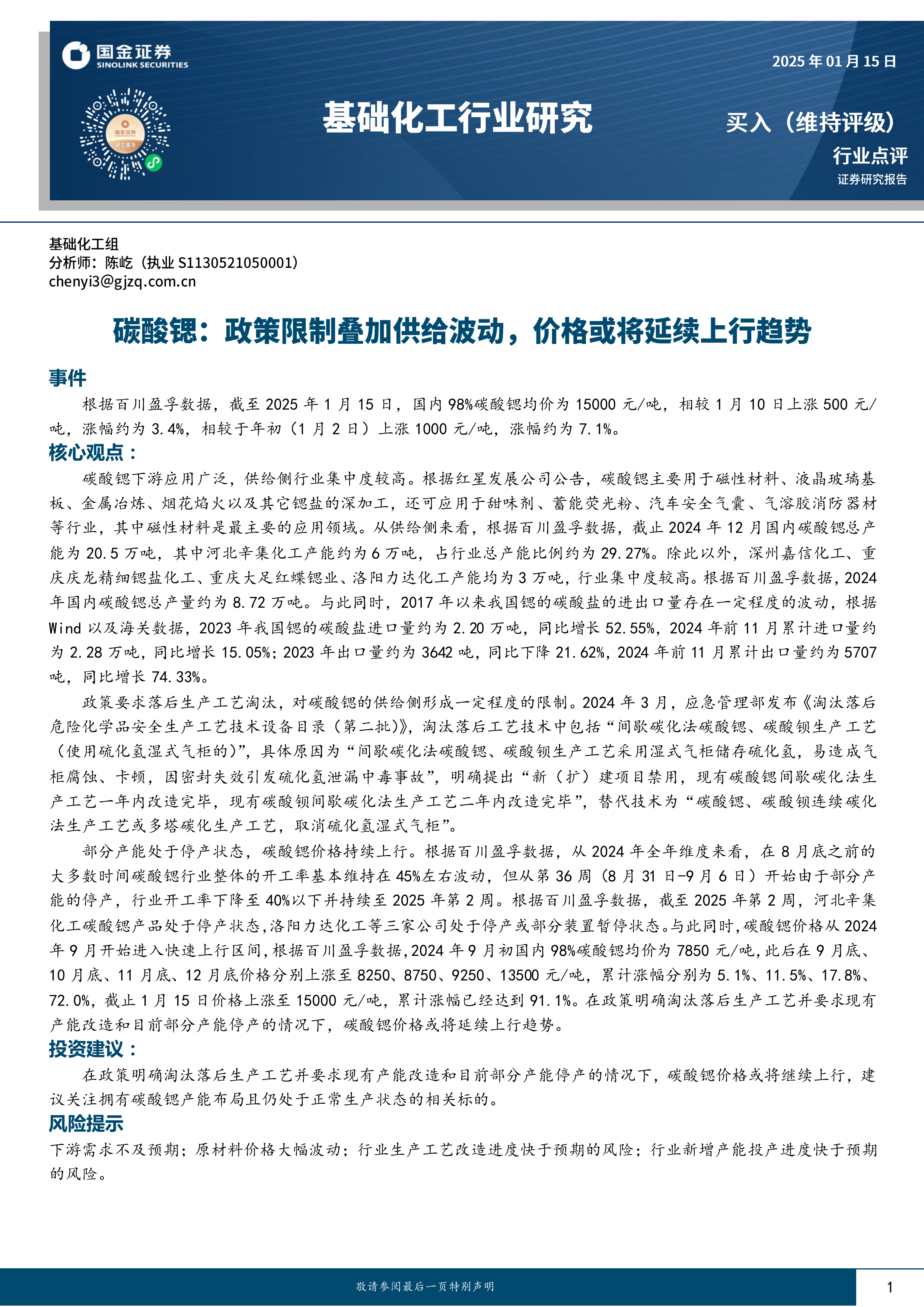 基础化工行业研究:碳酸锶:政策限制叠加供给波动,价格或将延续上行趋势