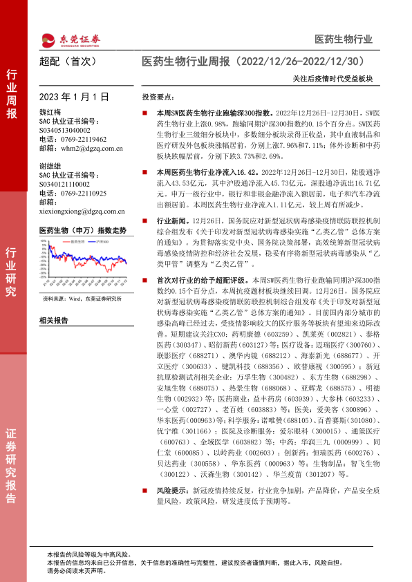 本报告的核心观点是:2022年12月26日至30日,SW医药生物行业表现略逊于沪深300指数,但多数细分板块仍录得正收益。尽管抗疫题材板块回调,但随着“乙类乙管”政策的实施,受疫情影响较大的板块有望迎来边际改善。东莞证券研究所给予医药生物行业首次超配评级,并推荐多个细分领域的优质标的。报告风险等级为中高风险,投资者需谨慎判断。