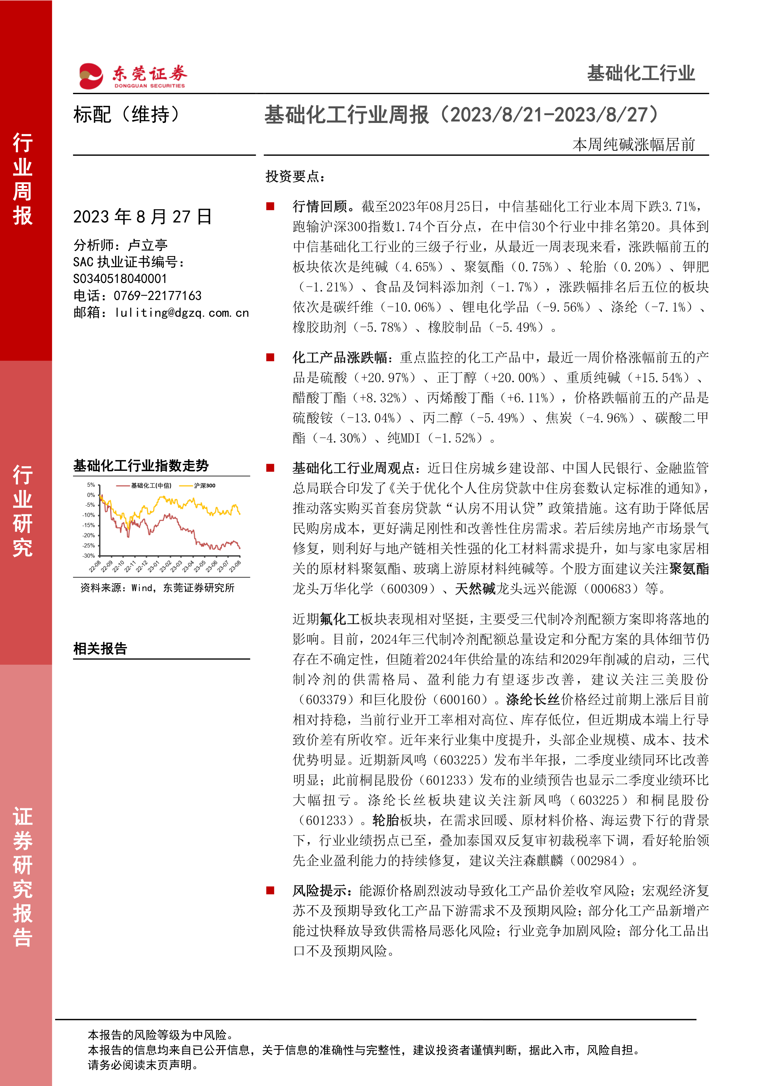 本报告对2023年8月21日至2023年8月27日基础化工行业进行了周度分析。行业整体表现疲软,但部分细分领域,如纯碱和氟化工板块表现强劲。房地产政策的调整为与地产相关的化工材料带来利好。报告建议投资者关注聚氨酯、纯碱、氟化工和轮胎等板块的龙头企业,同时需注意行业面临的各种风险。 报告数据主要来自Wind和百川盈孚等公开信息,投资者需谨慎判断,风险自担。
