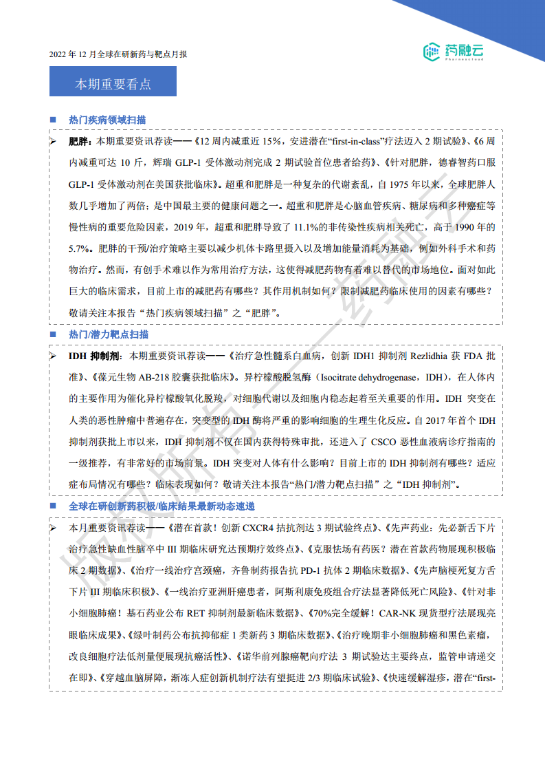 本报告总结了2022年12月全球在研新药与靶点市场动态,核心观点如下: