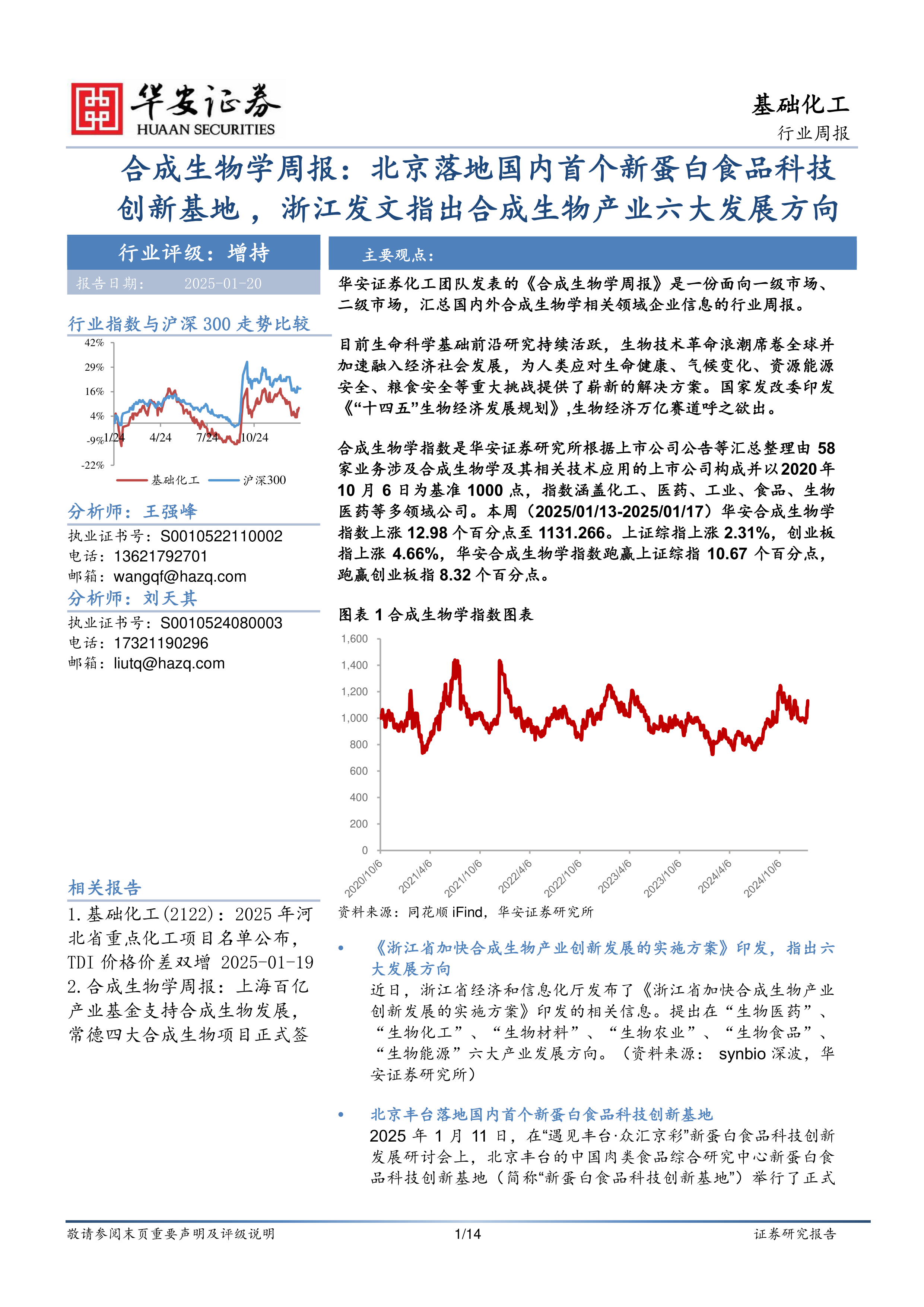 本周(2025/01/13-2025/01/17),华安合成生物学指数上涨12.98%,跑赢上证综指10.67个百分点,跑赢创业板指8.32个百分点。个股方面,祖名股份、百济神州等公司涨幅居前,而华恒生物、鲁抗医药等公司跌幅居前。涨幅前列的公司主要集中在食品、生物医药和医药行业。