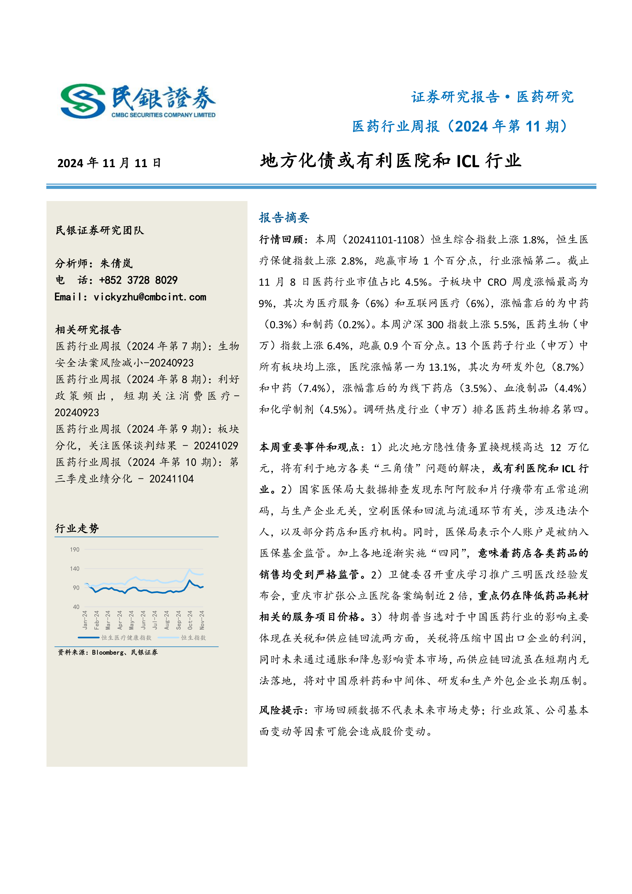 本报告的核心观点是:地方隐性债务置换以及医保监管加强将深刻影响医药行业,特别是医院和ICL行业将受益于债务置换,而加强监管将对医药流通环节产生重大影响。同时,国际局势变化(例如特朗普当选)也可能对中国医药行业,特别是原料药和研发外包企业产生长期影响。报告还分析了2024年第11周医药行业整体表现,以及各子板块的涨跌幅度和估值情况。