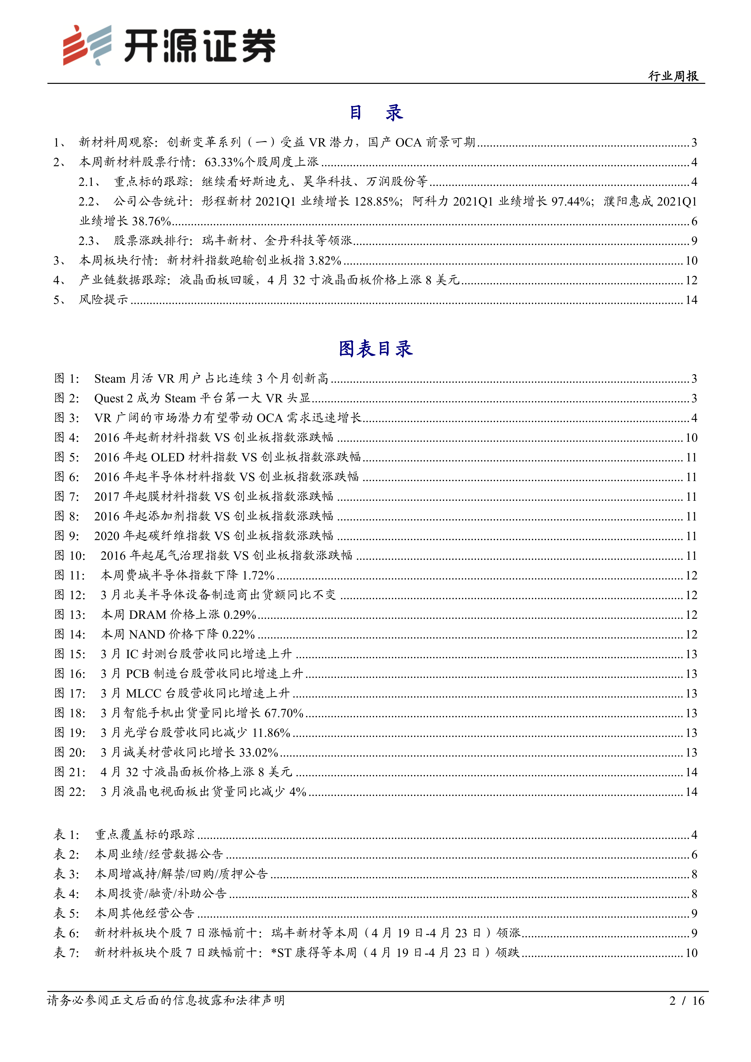 化工新材料周观察:创新变革系列(一)受益VR潜力,国产OCA前景可期随着VR硬件的不断升级、应用场景的不断丰富,行业关注度显著提升。Facebook最新款VR一体机OculusQuest2自2020年9月发布以来迅速成为爆款。据映维网预计,2020年Quest2销量约250万台,2021年以来销量已接近150万台。在VR广阔市场潜力的吸引以及Facebook爆款产品的示范效应下,索尼、苹果等科技巨头纷纷宣布布局新款AR/VR设备,AR/VR或将成为智能手机之后的下一个社交平台。据映维网的预测,Quest2在2021年的出货量约为600万台,乐观情形下可能达到900万台,仅考虑爆款的Quest2在2021年对OCA的需求规模就已经比较可观。未来随着VR/AR应用场景不断丰富、用户体验不断优化、成本不断降低以及各科技巨头新款设备的陆续面世,VR市场潜力有望持续释放,在未来或将成为日常应用设备,这将带动OCA市场规模的迅速扩大。斯迪克2019年公司便与Facebook合作开发VR眼镜的OCA产品。OCA是胶膜行业金字塔的顶端,具备很高的技术壁垒,斯迪克致力于新材料的国产化替代,在OCA的开发过程中全面提升涂层材料制备、涂布等核心能力。虽然斯迪克在料号数量的积累上与3M等国际巨头依然存在差距,但在技术难度较高的OCA领域已经实现追赶。公司将不断缩小国际差距,打造国产OCA光学胶膜的世界级领先企业。