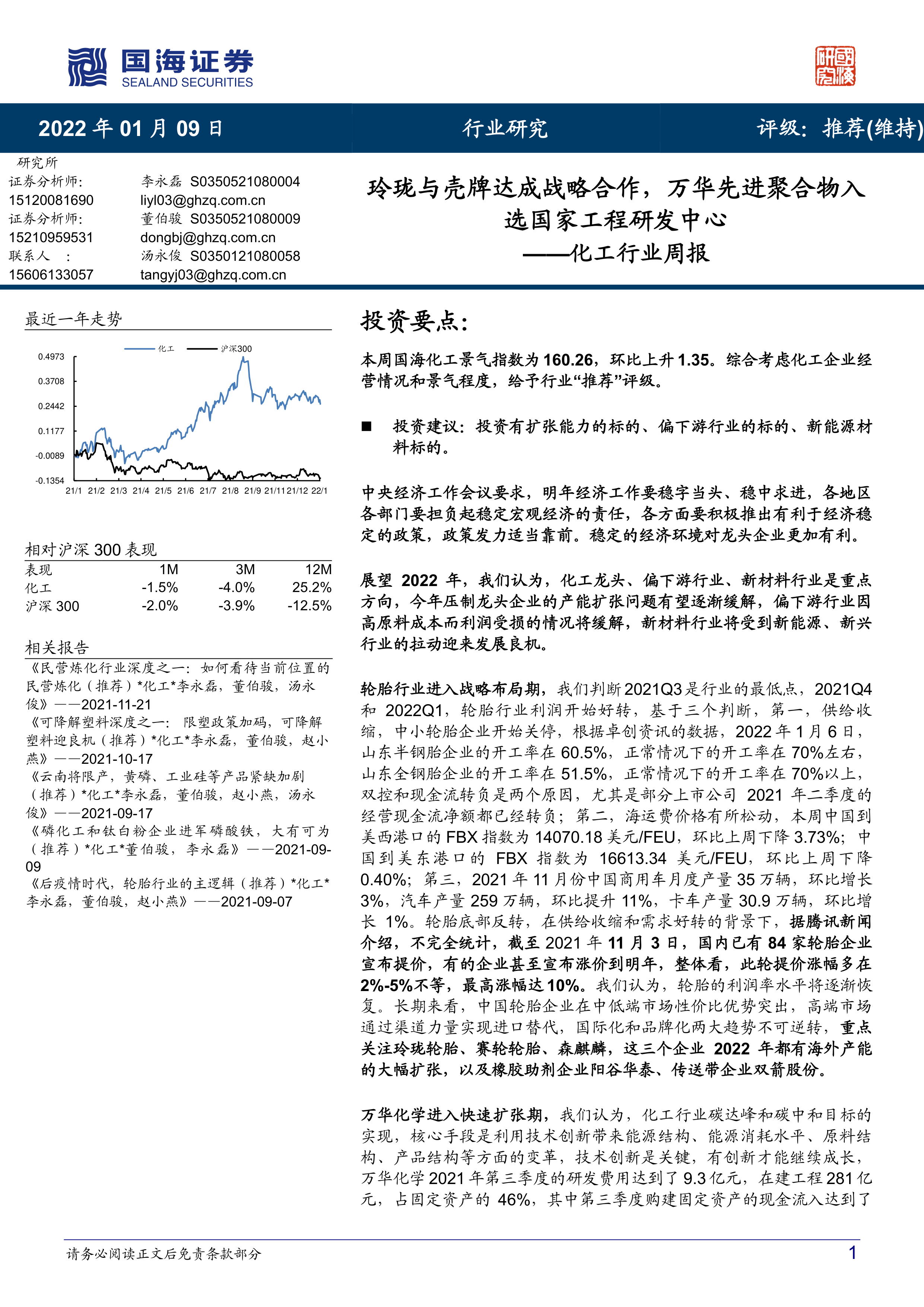 报告对万华化学、玲珑轮胎、赛轮轮胎、森麒麟、恒力石化、荣盛石化、东方盛虹、恒逸石化、桐昆股份、新凤鸣、新洋丰、云图控股、龙佰集团、阳谷华泰、双箭股份、华峰化学、新和成、三友化工、华鲁恒升、宝丰能源、金禾实业、瑞华泰、赞宇科技、国瓷材料、扬农化工、利尔化学、长青股份、卫星化学、江化微、雅克科技、三棵树、道恩股份、利安隆、万润股份、蓝晓科技等多家化工企业进行了详细的跟踪和分析,内容涵盖了公司基本面、产品价格走势、产能扩张计划、研发投入以及政府补贴等方面。