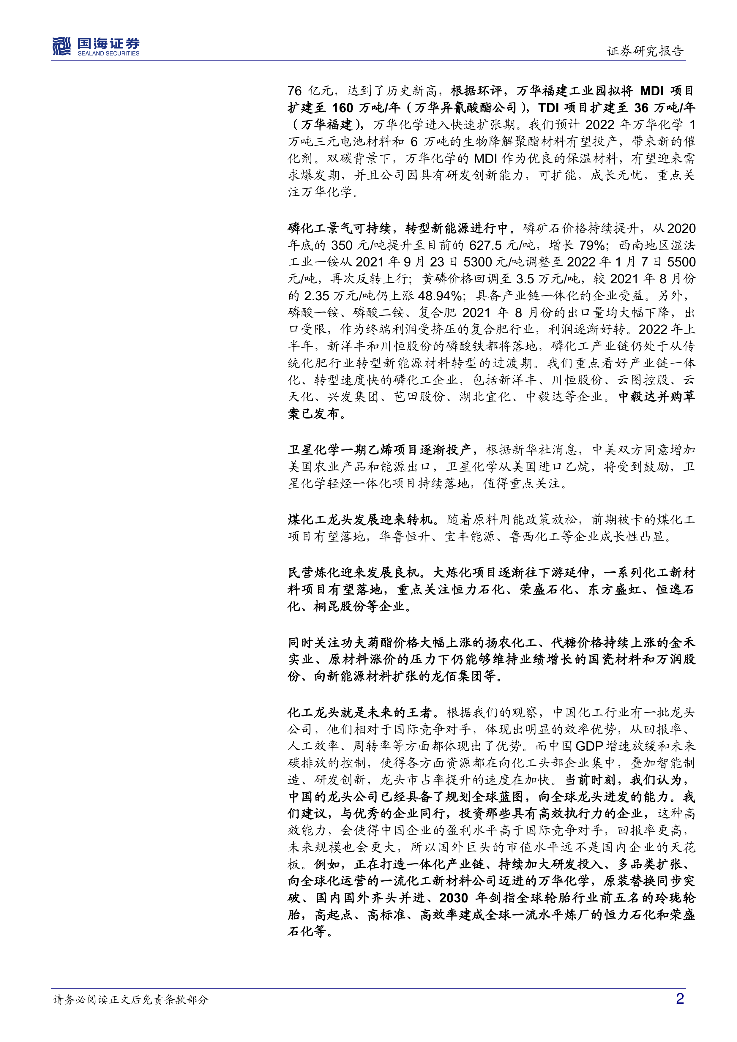 化工龙头就是未来的王者。根据我们的观察,中国化工行业有一批龙头公司,他们相对于国际竞争对手,体现出明显的效率优势,从回报率、人工效率、周转率等方面都体现出了优势。而中国GDP增速放缓和未来碳排放的控制,使得各方面资源都在向化工头部企业集中,叠加智能制造、研发创新,龙头市占率提升的速度在加快。当前时刻,我们认为,中国的龙头公司已经具备了规划全球蓝图,向全球龙头进发的能力。我们建议,与优秀的企业同行,投资那些具有高效执行力的企业,这种高效能力,会使得中国企业的盈利水平高于国际竞争对手,回报率更高,未来规模也会更大,所以国外巨头的市值水平远不是国内企业的天花板。例如,正在打造一体化产业链、持续加大研发投入、多品类扩张、向全球化运营的一流化工新材料公司迈进的万华化学,原装替换同步突破、国内国外齐头并进、2030年剑指全球轮胎行业前五名的玲珑轮胎,高起点、高标准、高效率建成全球一流水平炼厂的恒力石化和荣盛石化等。我们重点看好仍然被低估的各细分领域龙头,比如向全球化工新材料巨头迈进的万华化学、轮胎行业的龙头玲珑轮胎以及赛轮轮胎和森麒麟、民营炼化巨头(恒力石化、荣盛石化、东方盛虹、桐昆股份、恒逸石化、新凤鸣)、复合肥领域的新洋丰和云图控股、橡胶助剂龙头阳谷华泰、粘胶短纤龙头三友化工、维生素龙头新和成、煤化工龙头华鲁恒升、新型煤化工龙头宝丰能源、农药领域的扬农化工、草铵膦龙头利尔化学无机新材料领域的龙头国瓷材料、C2/C3领域的卫星化学、甜味剂龙头金禾实业、植物生长调节剂龙头国光股份、钛白粉龙头龙佰集团、氨纶和己二酸龙头华峰化学、有机精细化工品龙头万润股份、麦草畏企业长青股份、油脂化工龙头赞宇科技等。