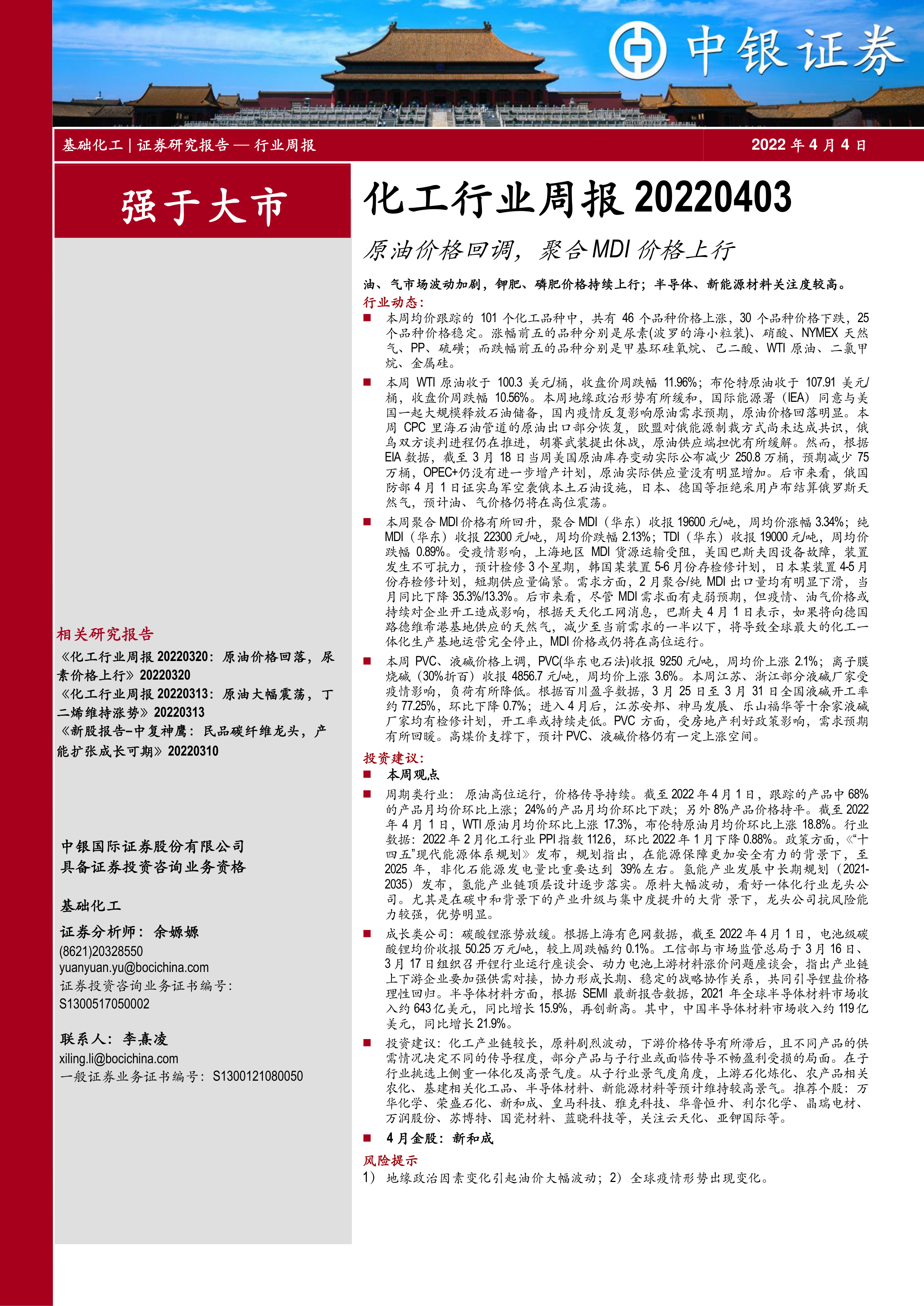 本报告对2022年4月4日一周的化工行业进行了全面分析,重点关注了原油价格波动、疫情影响以及主要化工产品的价格变化。报告指出,化工行业受多种因素影响,不同子行业景气度差异较大。投资者应关注一体化龙头企业和高景气度子行业,并密切关注原油价格和疫情发展对行业的影响。报告最后推荐了部分个股和4月金股,为投资者提供投资参考。 需要注意的是,报告中提到的投资建议仅供参考,投资者应根据自身情况进行独立判断,并承担相应的投资风险。
