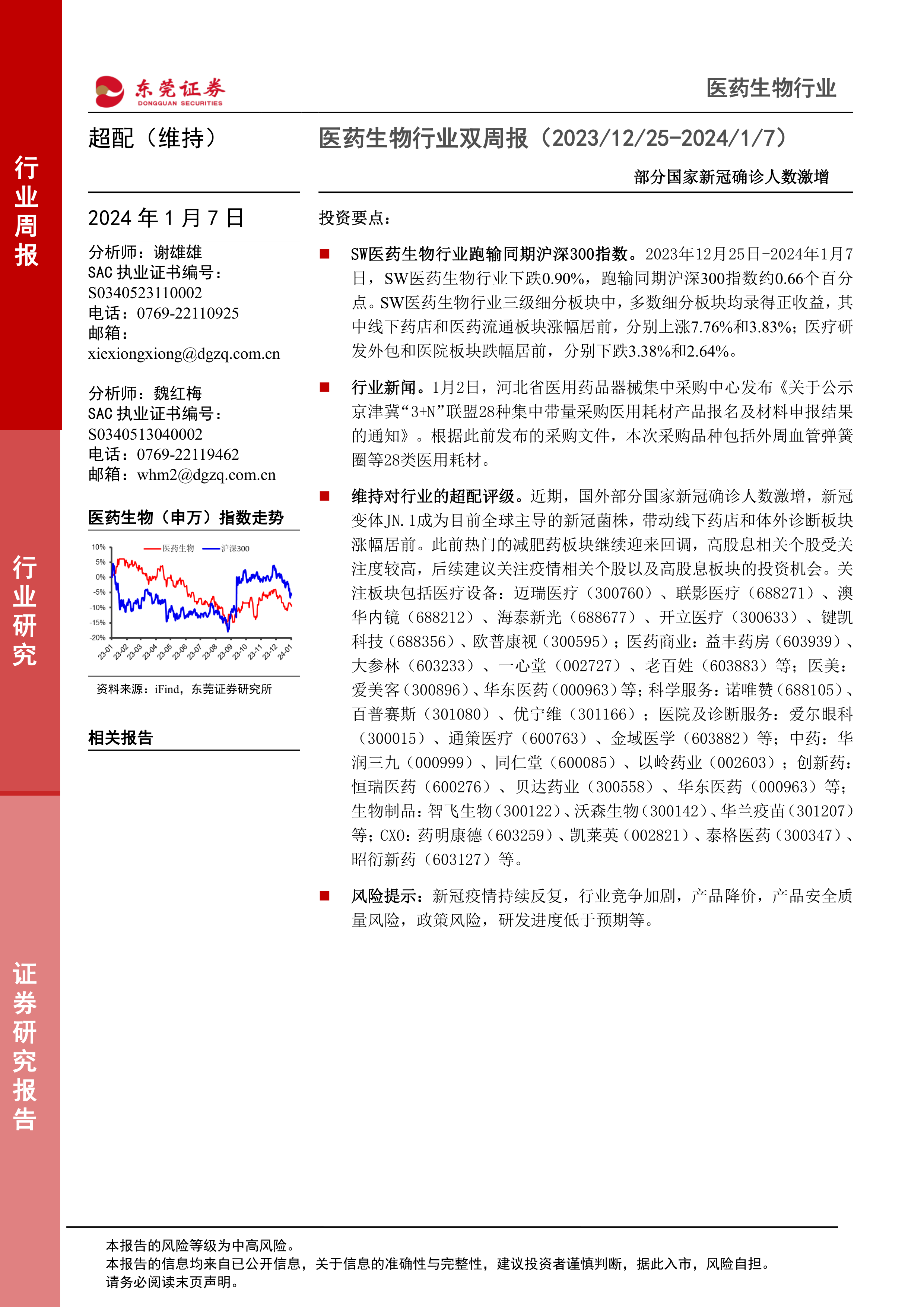 本报告对2023年12月25日至2024年1月7日期间SW医药生物行业的表现进行了全面分析。 行业整体表现弱于沪深300指数,但细分板块表现分化明显,部分板块表现强劲,部分板块表现低迷。 国外疫情反复以及高股息个股的关注度提升,推动部分板块上涨。 报告维持对医药生物行业的超配评级,并建议关注疫情相关个股以及高股息板块的投资机会,同时提醒投资者注意行业面临的多种风险。 报告内容基于公开信息,投资者应谨慎判断,风险自担。