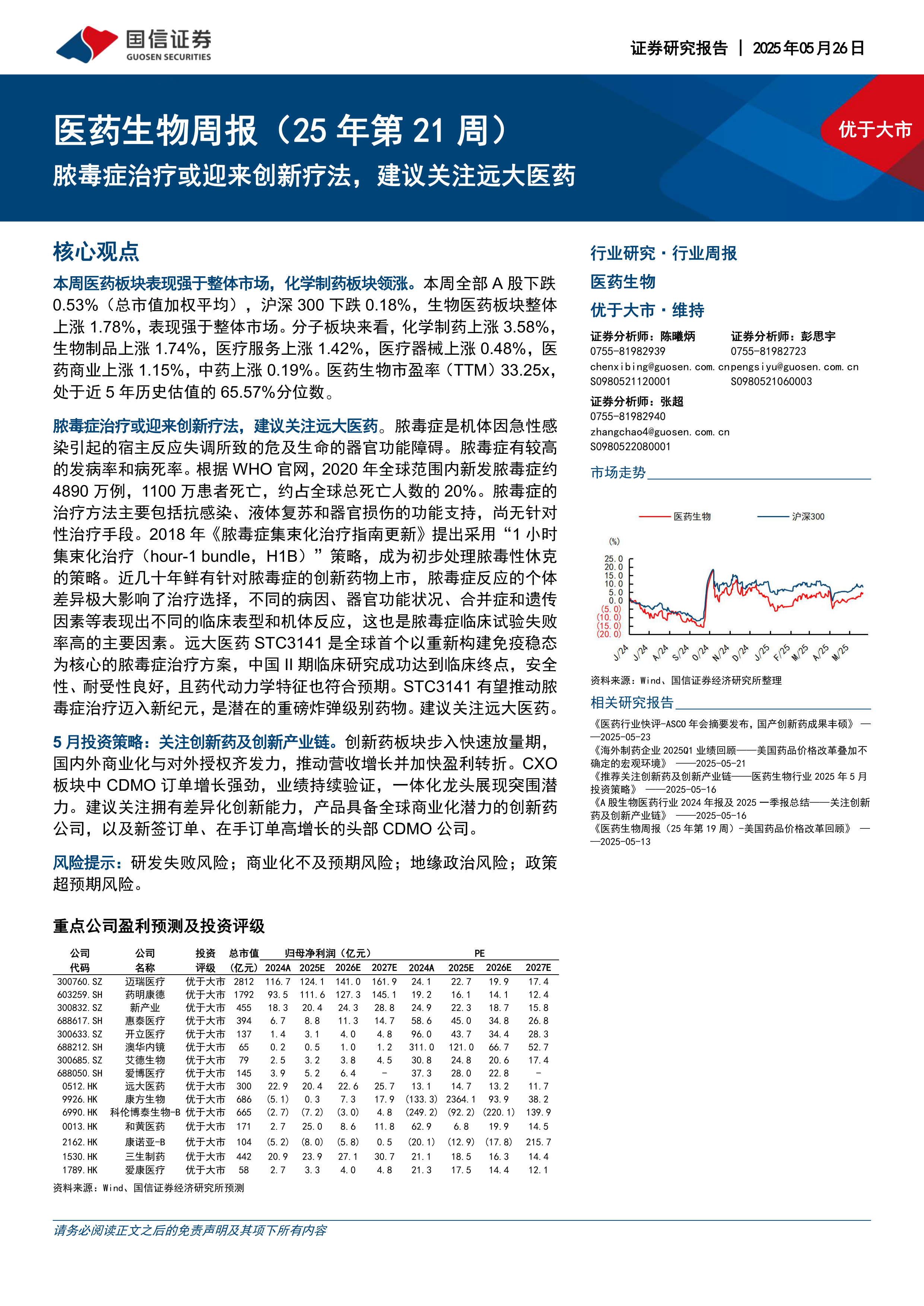 本报告为医药生物周报,总结了2025年第21周(5月26日)医药板块的市场表现和行业动态。报告指出医药板块整体表现强于大盘,并对各子板块的涨跌幅和估值进行了详细分析。
