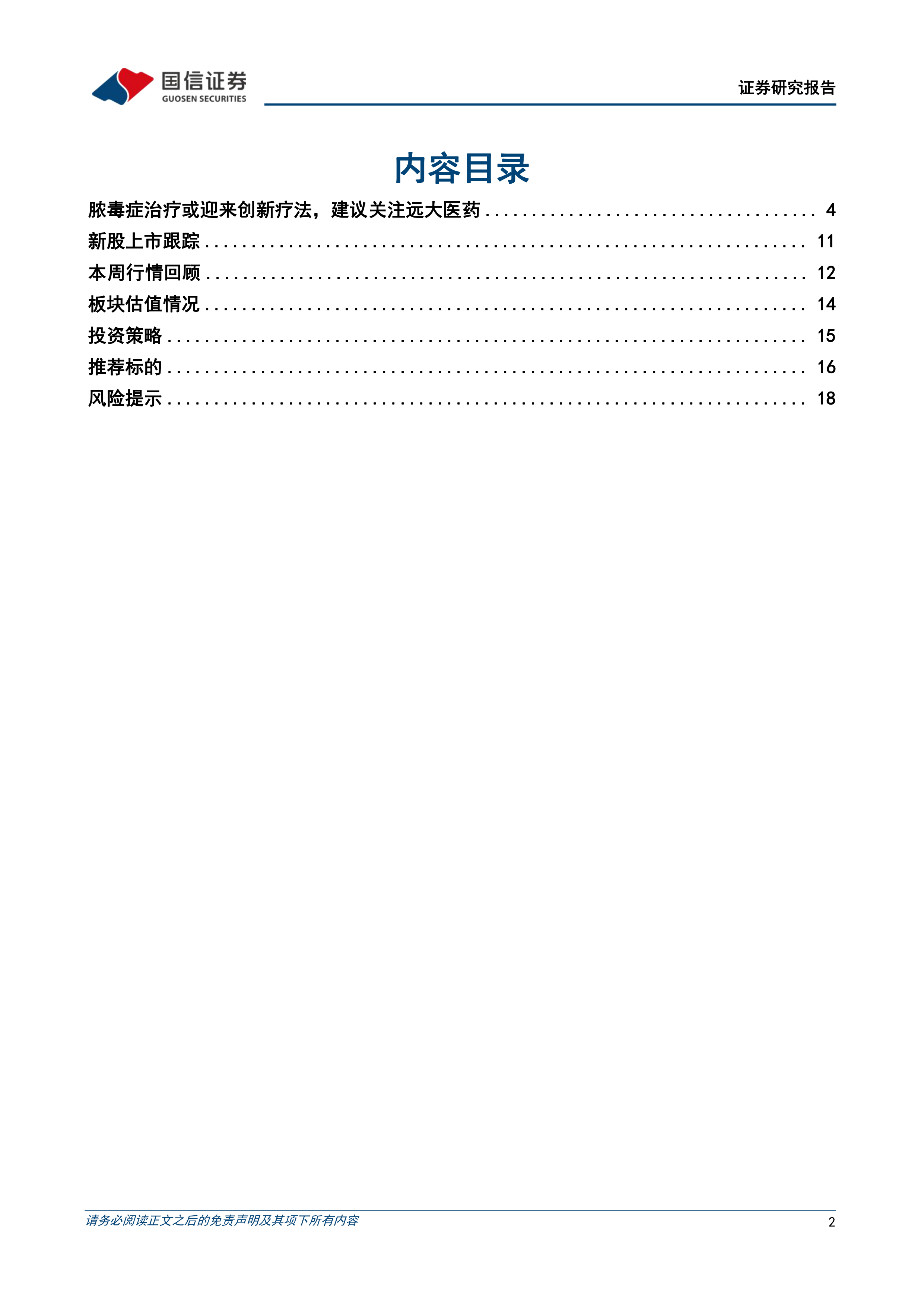 本报告的核心观点是:医药生物板块本周表现强于大盘,化学制药板块领涨;脓毒症治疗领域或将迎来创新疗法,远大医药的STC3141药物值得关注。