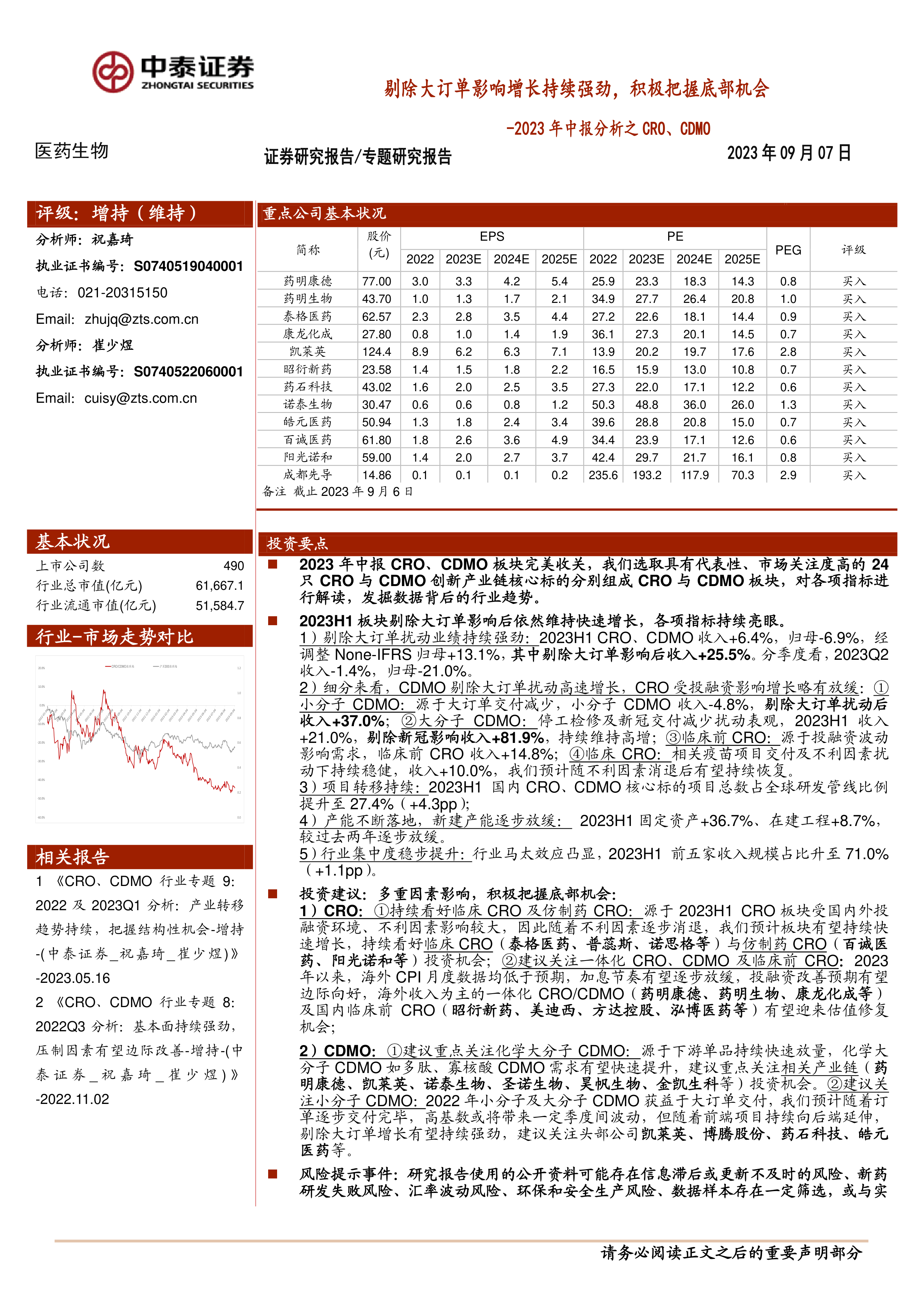 医药生物专题研究报告:2023年中报分析之CRO、CDMO-剔除大订单影响增长持续强劲,积极把握底部机会