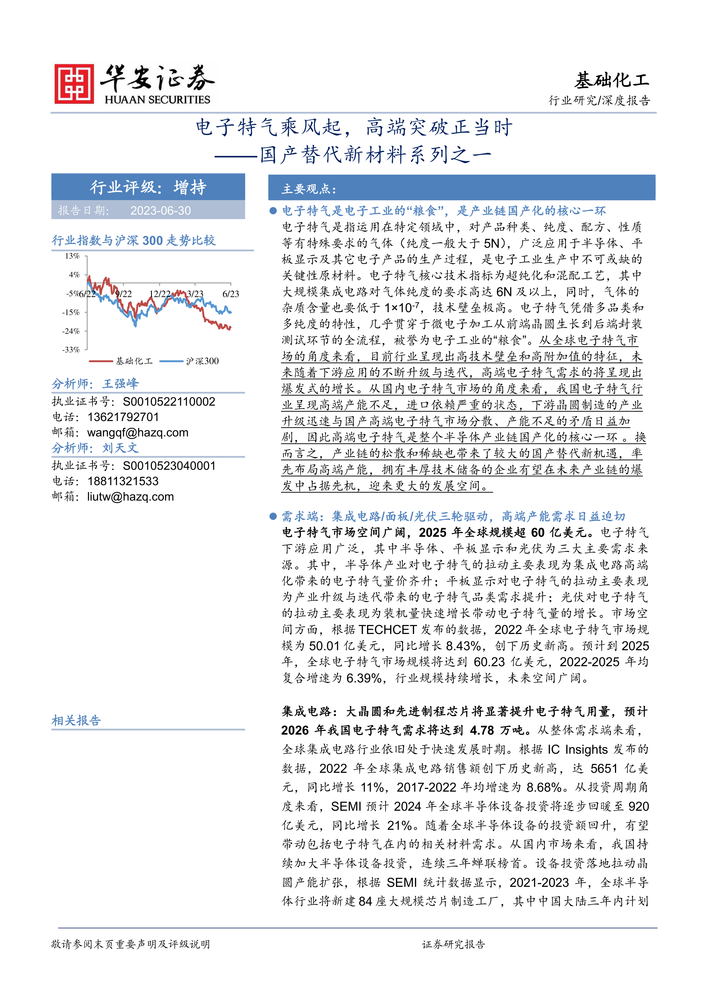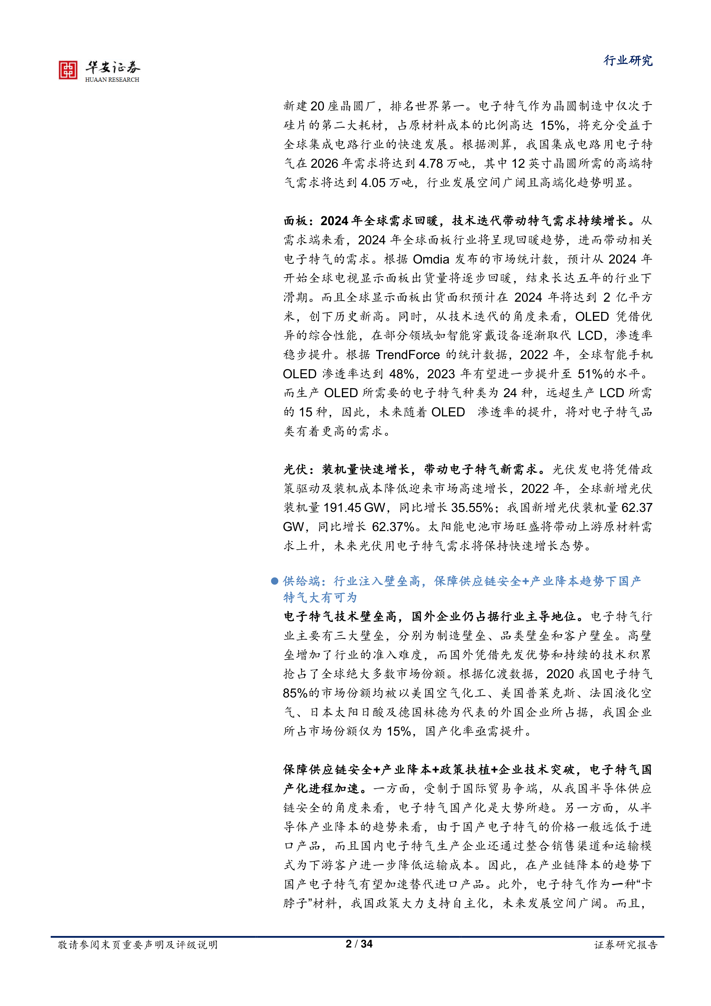 报告最后给出了投资建议,推荐关注具备平台化潜力的优质电子特气企业,并列出了具体的公司名单及相关财务数据(EPS、PE等)。 同时,报告也列出了相应的投资风险提示。