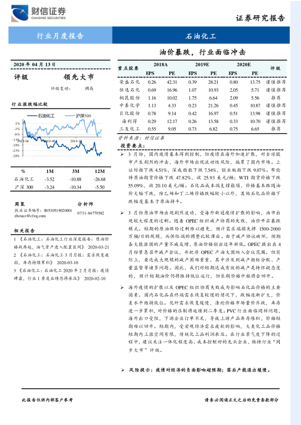 本报告的核心观点是:2020年3月,全球油价暴跌对石油化工行业造成巨大冲击。疫情在海外的蔓延加剧了全球原油市场供过于求的局面,OPEC减产协商失败更是雪上加霜,导致原油价格创下近年新低。石化产品价格随之下跌,行业整体景气度下降,传统化工品利润承压。报告建议关注一体化程度高、成本控制好的龙头企业,并对部分重点股票进行评级和分析。