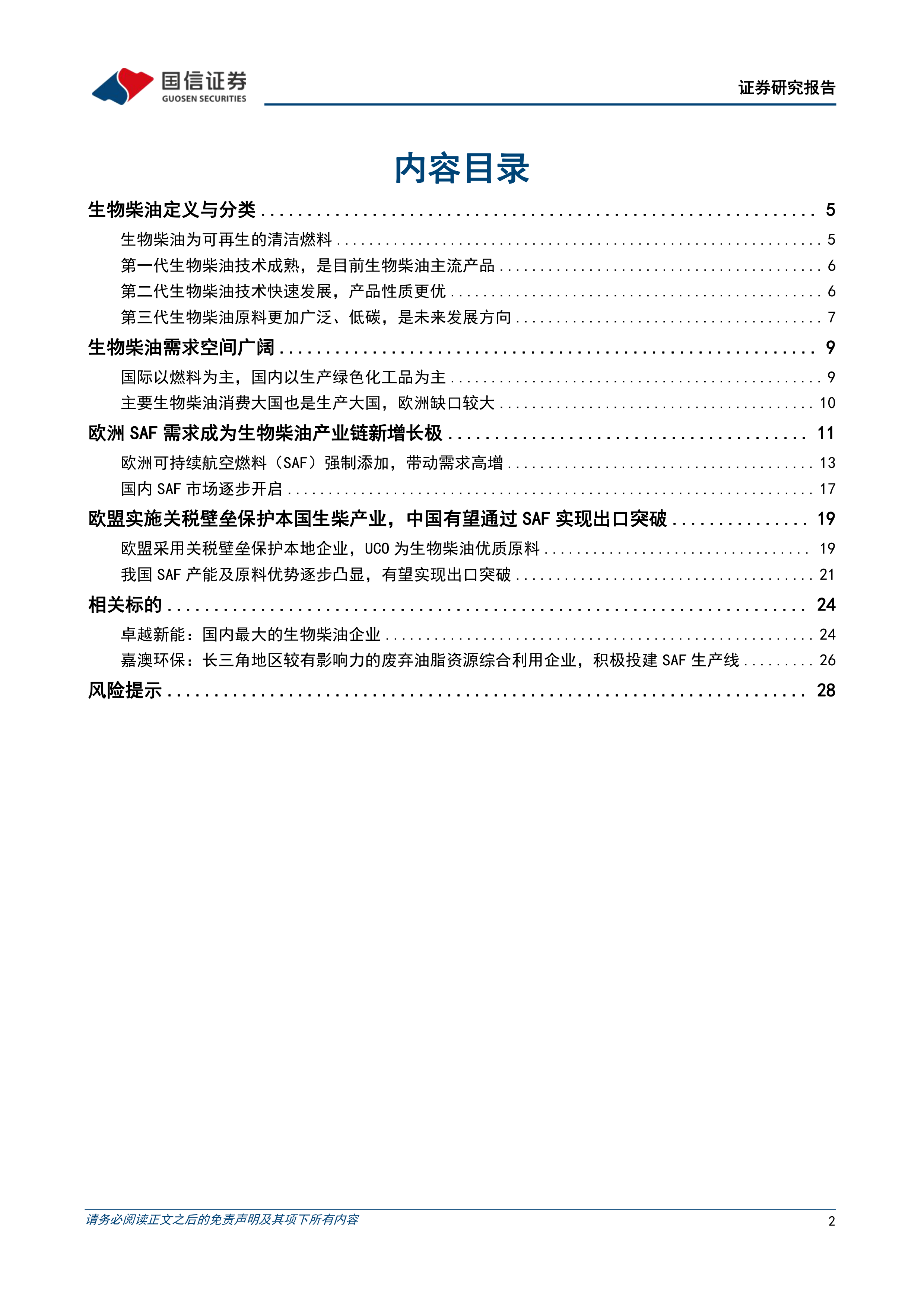 风险提示:可持续航空燃料(SAF)价格大幅下跌的风险;欧盟SAF需求不及预期的风险;国内二代生物柴油、SAF产能建设及投放不及预期;欧盟、中国SAF政策变化的风险。