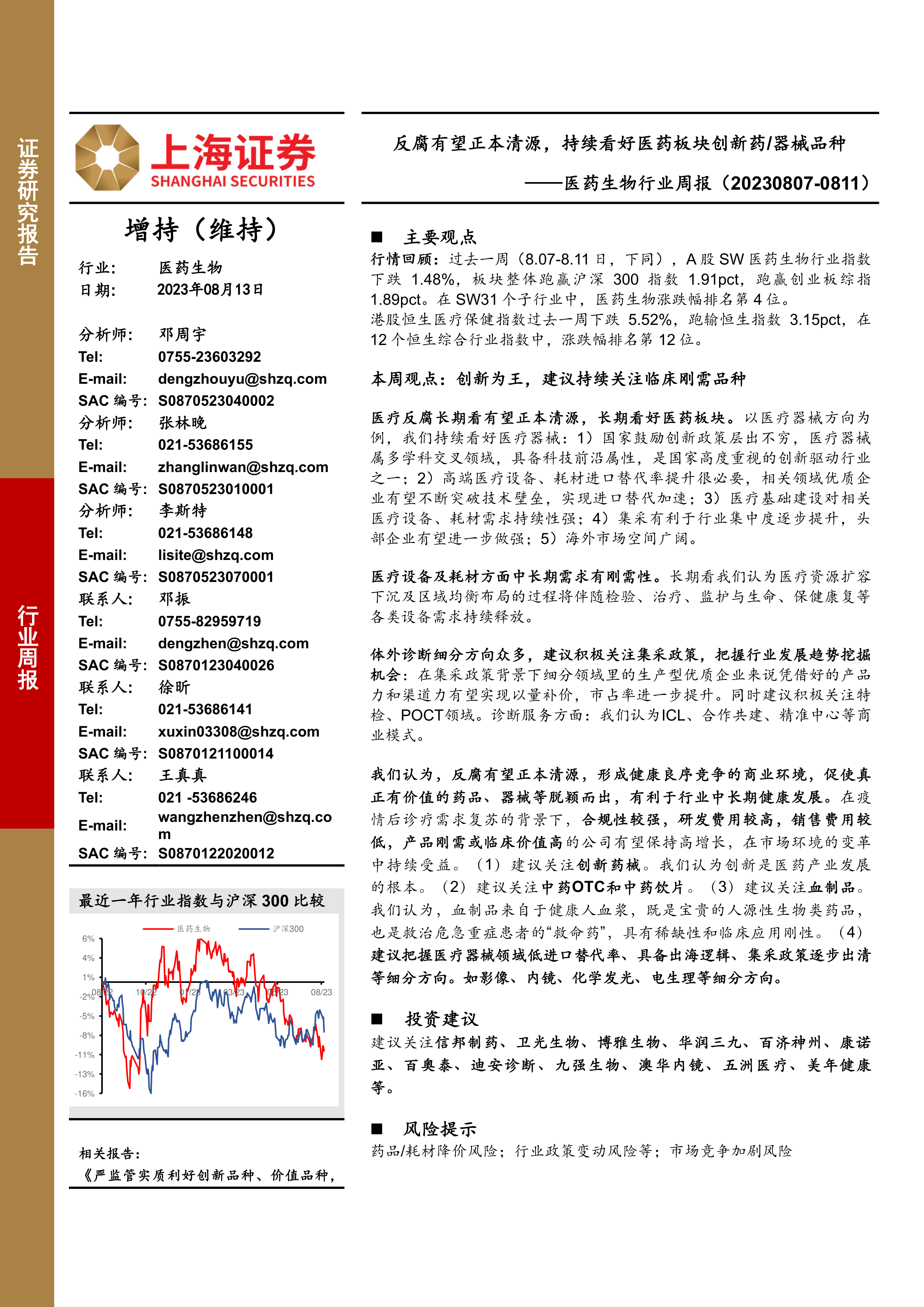医药生物行业周报:反腐有望正本清源,持续看好医药板块创新药/器械品种