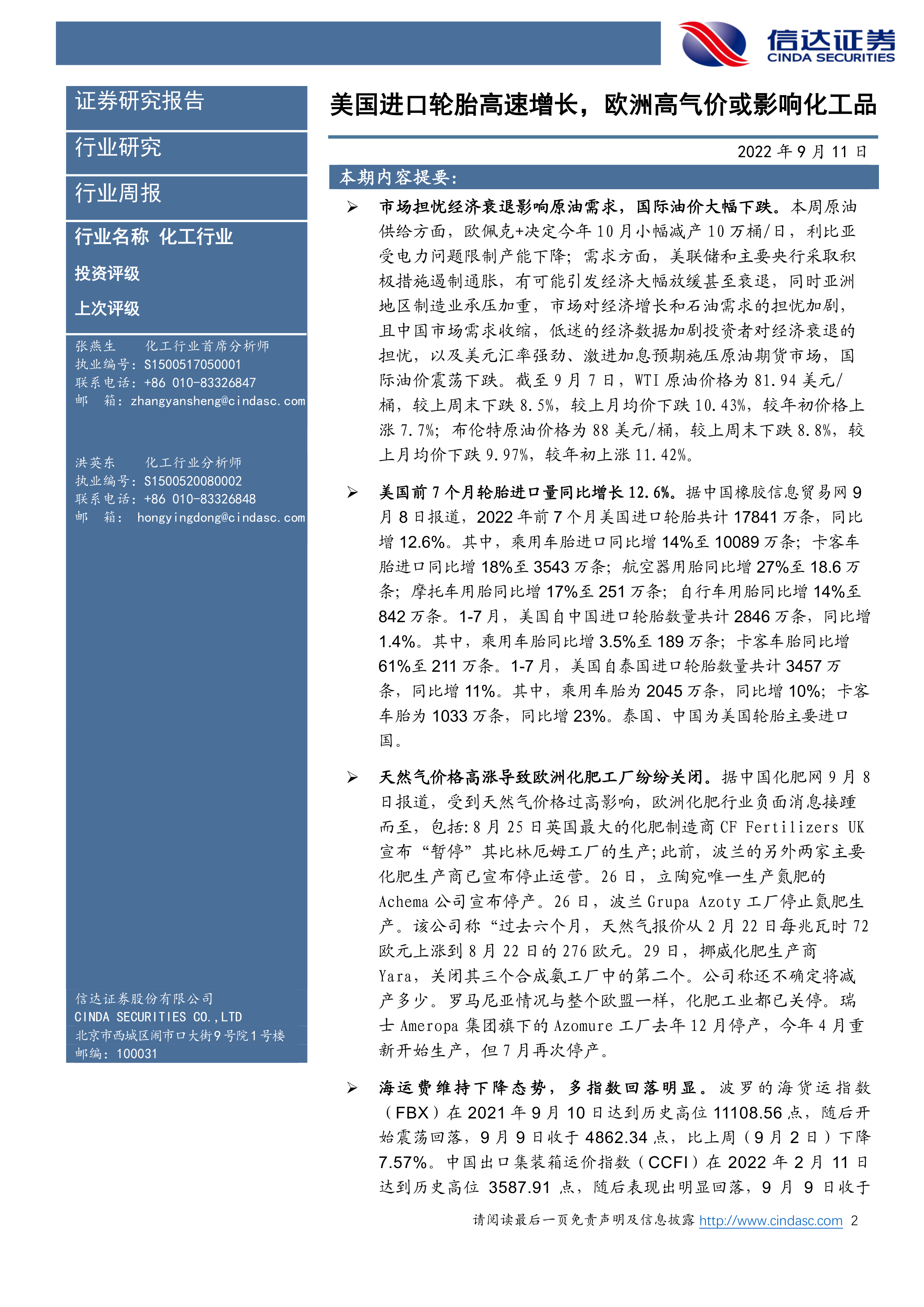 化工行业周报:美国进口轮胎高速增长,欧洲高气价或影响化工品