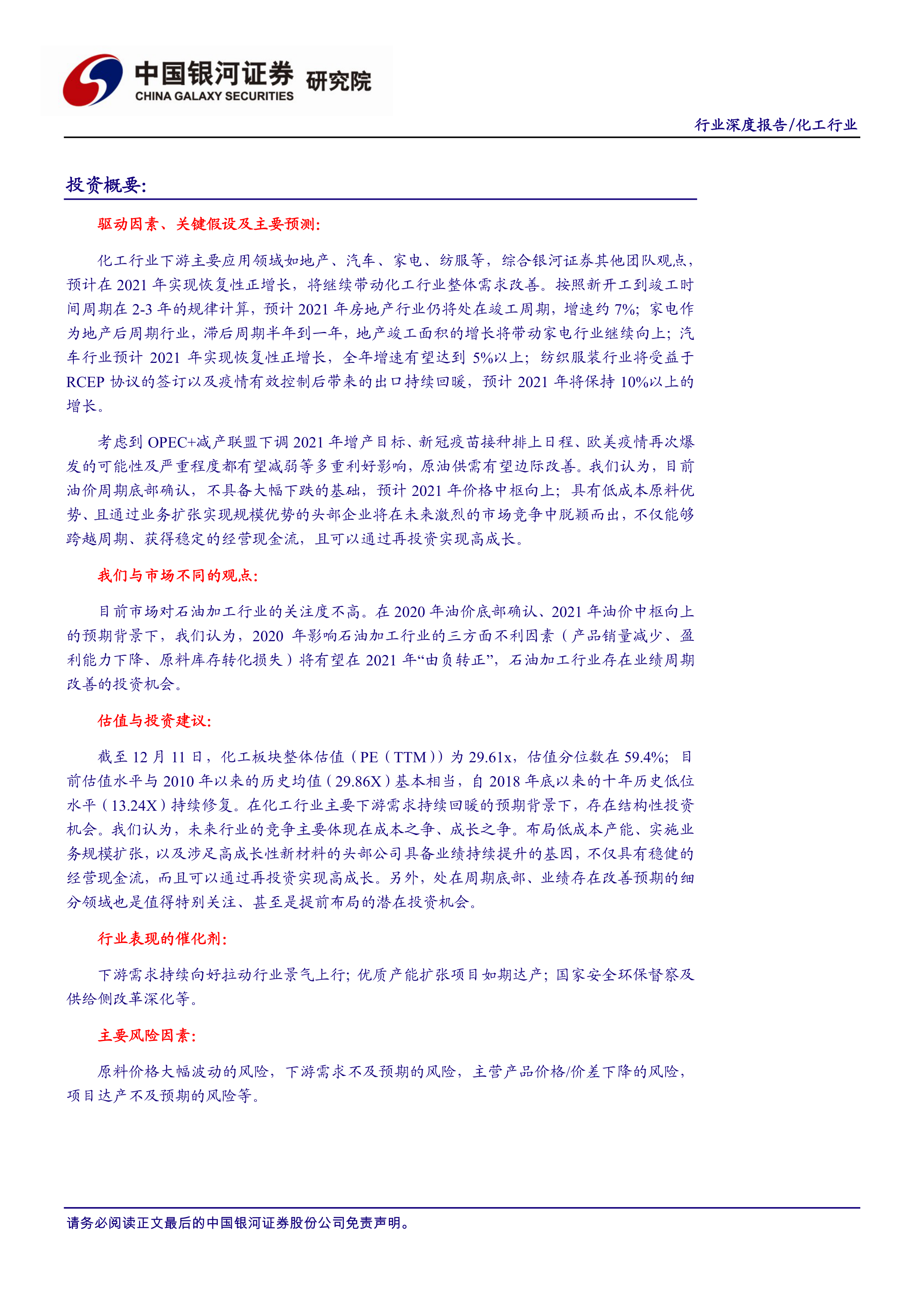 本报告的核心观点是:2021年化工行业将呈现顺周期景气向上态势,行业盈利将持续改善。 主要驱动力来自下游需求的恢复性增长(地产、汽车、家电、纺服等)以及原油价格的中枢上行。然而,行业竞争将日益激烈,主要体现在成本之争和成长之争两个方面。 因此,报告建议投资者关注具备低成本优势、规模优势以及在新材料领域具有发展潜力的头部企业,并关注周期底部、业绩有望改善的细分领域。