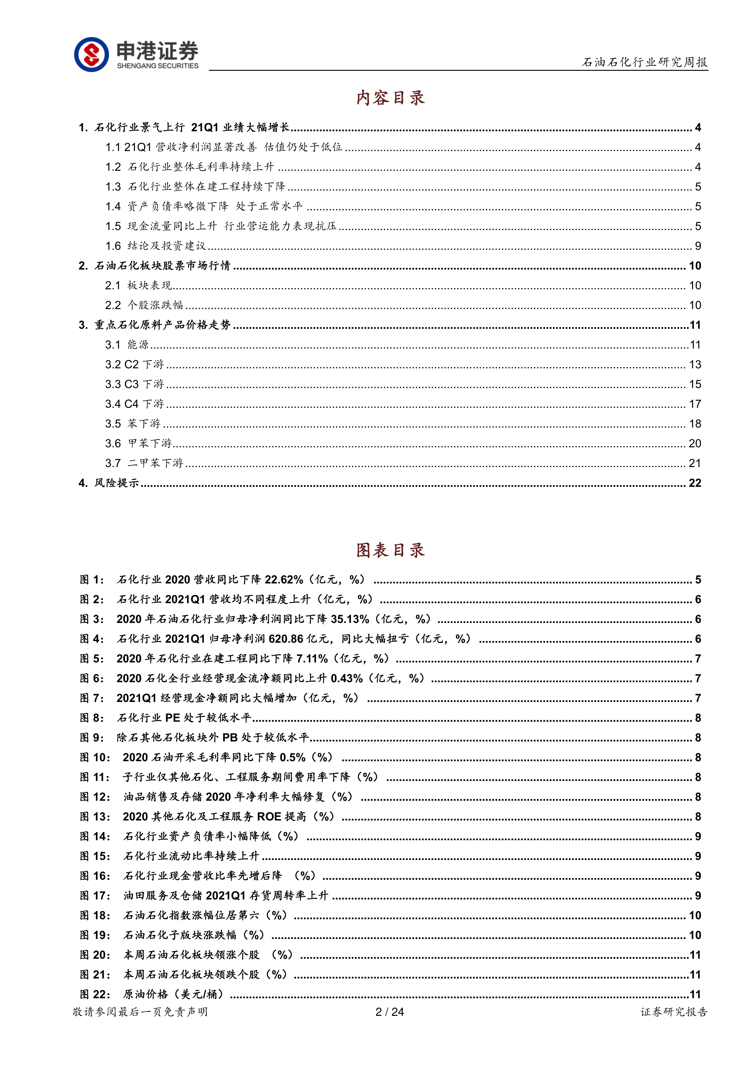 本报告基于申港证券研究所提供的2020年报及2021年第一季度报告数据,对石油石化行业进行了全面的市场分析。报告指出,2020年行业整体业绩承压,但2021年第一季度业绩显著修复,景气度上行。未来,在油价相对稳定和全球经济持续改善的背景下,行业龙头企业的中期业绩有望持续提升。 报告同时提示了投资者需要注意的潜在风险,为投资者提供更全面的决策参考。 报告中大量使用了图表数据,清晰地展现了行业发展趋势和关键指标变化,具有较强的专业性和分析性。