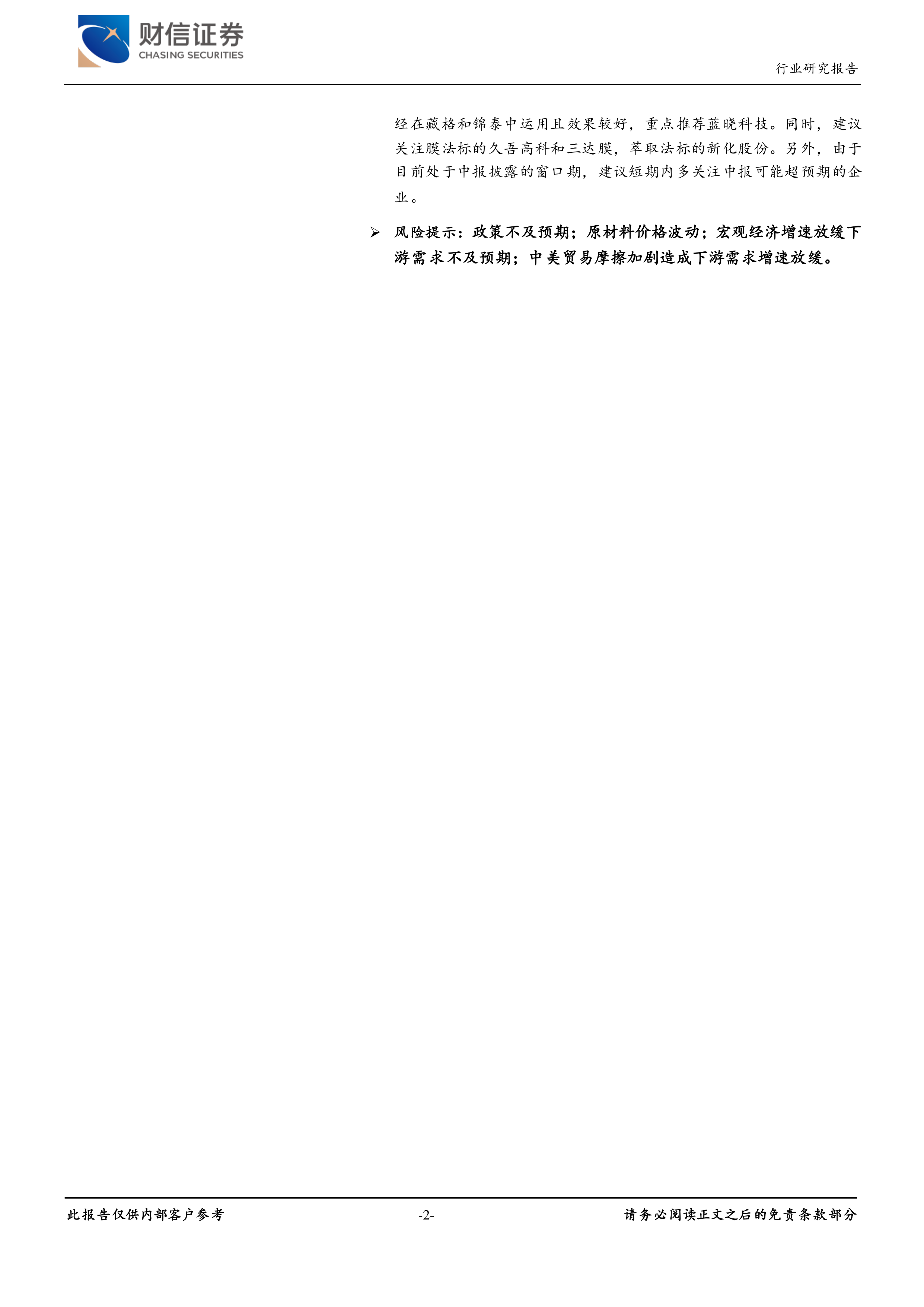 风险提示:政策不及预期;原材料价格波动;宏观经济增速放缓下游需求不及预期;中美贸易摩擦加剧造成下游需求增速放缓。