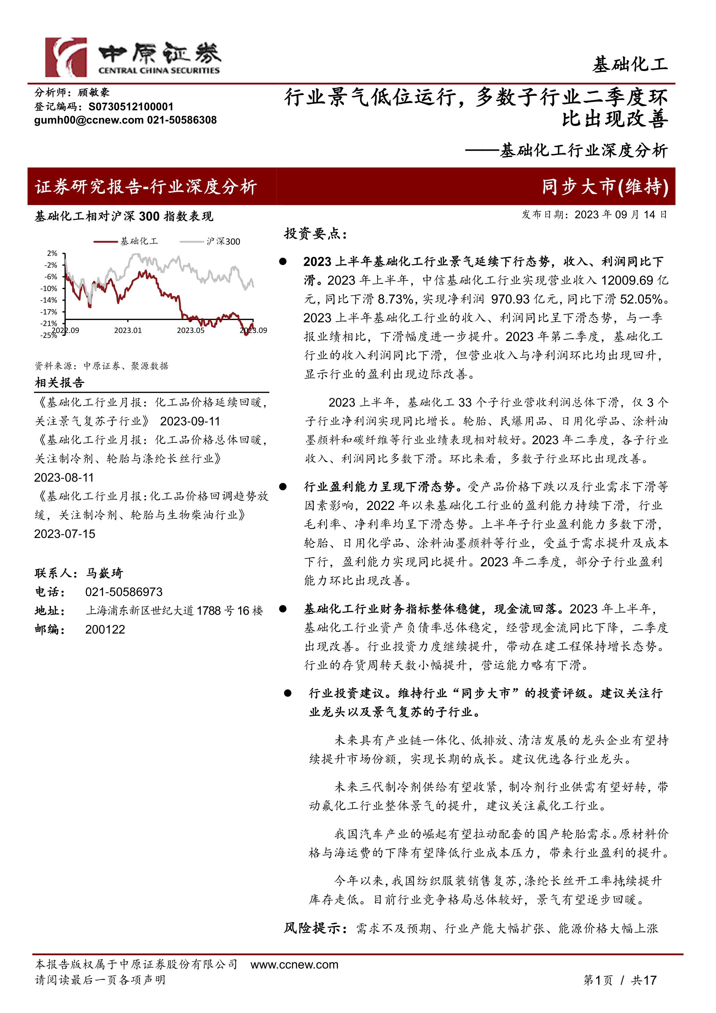 本报告的核心观点是:2023年上半年,基础化工行业景气度持续低迷,收入和利润均出现大幅下滑;但二季度环比数据显示,行业盈利能力出现边际改善,部分子行业表现出复苏迹象。 报告建议维持行业“同步大市”的投资评级,并重点关注行业龙头企业以及景气度有望复苏的子行业,例如制冷剂、轮胎和涤纶长丝行业。