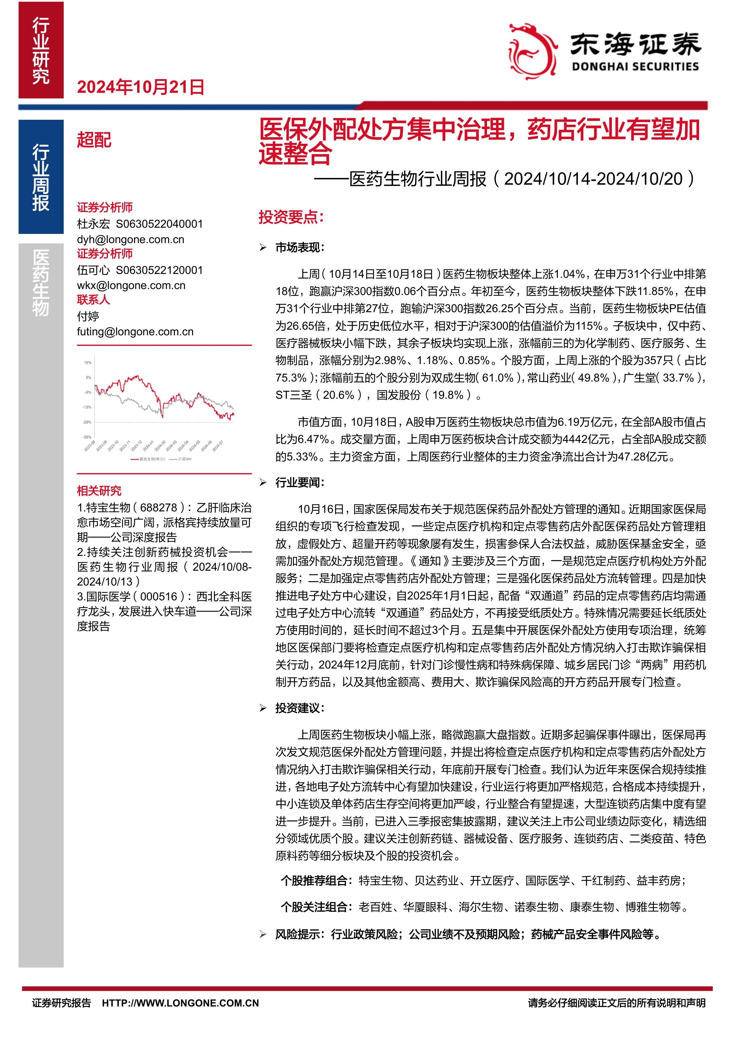 上周医药生物板块小幅上涨,略微跑赢大盘指数。近期多起骗保事件曝出,医保局再次发文规范医保外配处方管理问题,并提出将检查定点医疗机构和定点零售药店外配处方情况纳入打击欺诈骗保相关行动,年底前开展专门检查。我们认为近年来医保合规持续推进,各地电子处方流转中心有望加快建设,行业运行将更加严格规范,合格成本持续提升,中小连锁及单体药店生存空间将更加严峻,行业整合有望提速,大型连锁药店集中度有望进一步提升。当前,已进入三季报密集披露期,建议关注上市公司业绩边际变化,精选细分领域优质个股。建议关注创新药链、器械设备、医疗服务、连锁药店、二类疫苗、特色原料药等细分板块及个股的投资机会。