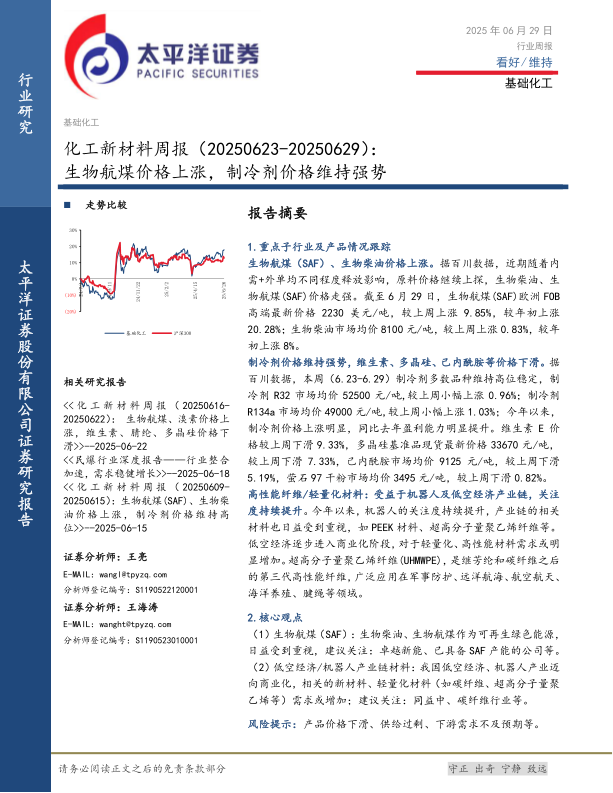 本周基础化工行业周报深入分析了化工新材料市场的最新动态,核心观点聚焦于生物航煤(SAF)和制冷剂等产品的价格强势上涨,以及高性能纤维、轻量化材料在低空经济和机器人产业链中的巨大潜力。报告强调了绿色能源和先进材料作为“新质生产力”的重要组成部分,正日益受到重视。同时,电子化学品领域的国产替代进程加速,为国内相关企业带来发展机遇。尽管部分传统化工产品价格有所下滑,但整体来看,化工新材料在政策支持和下游需求拉动下,展现出多维度的增长态势。