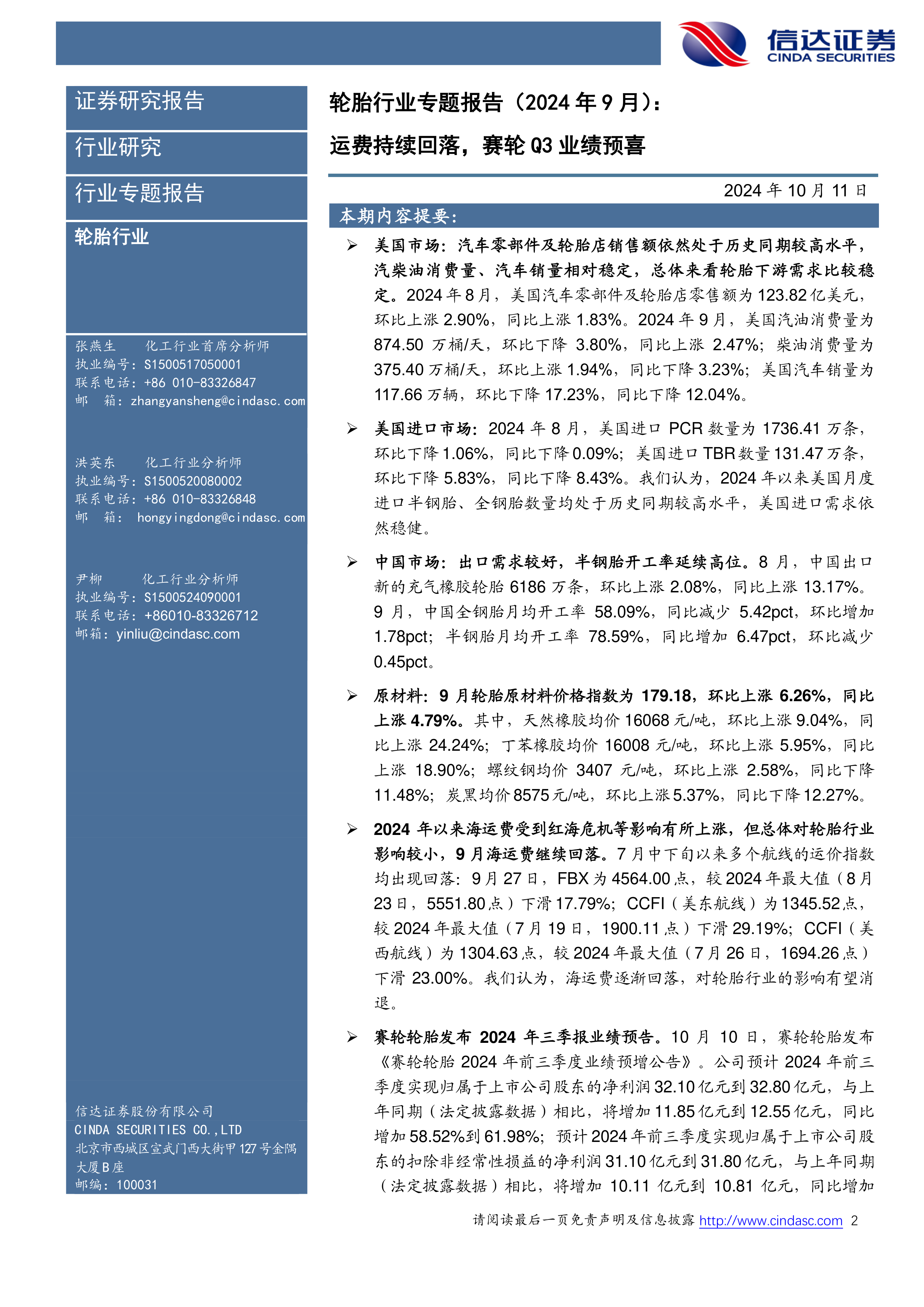 本报告的核心观点是:2024年9月,轮胎行业整体表现稳健,呈现出供需两旺的态势。尽管原材料价格上涨,但海运费持续回落,对行业影响有限。中国轮胎出口持续增长,开工率维持高位,而美国市场需求也保持相对稳定。赛轮轮胎Q3业绩预喜,体现了行业良好的发展前景。然而,宏观经济下行风险、原材料价格波动以及政策不确定性仍是行业面临的主要挑战。