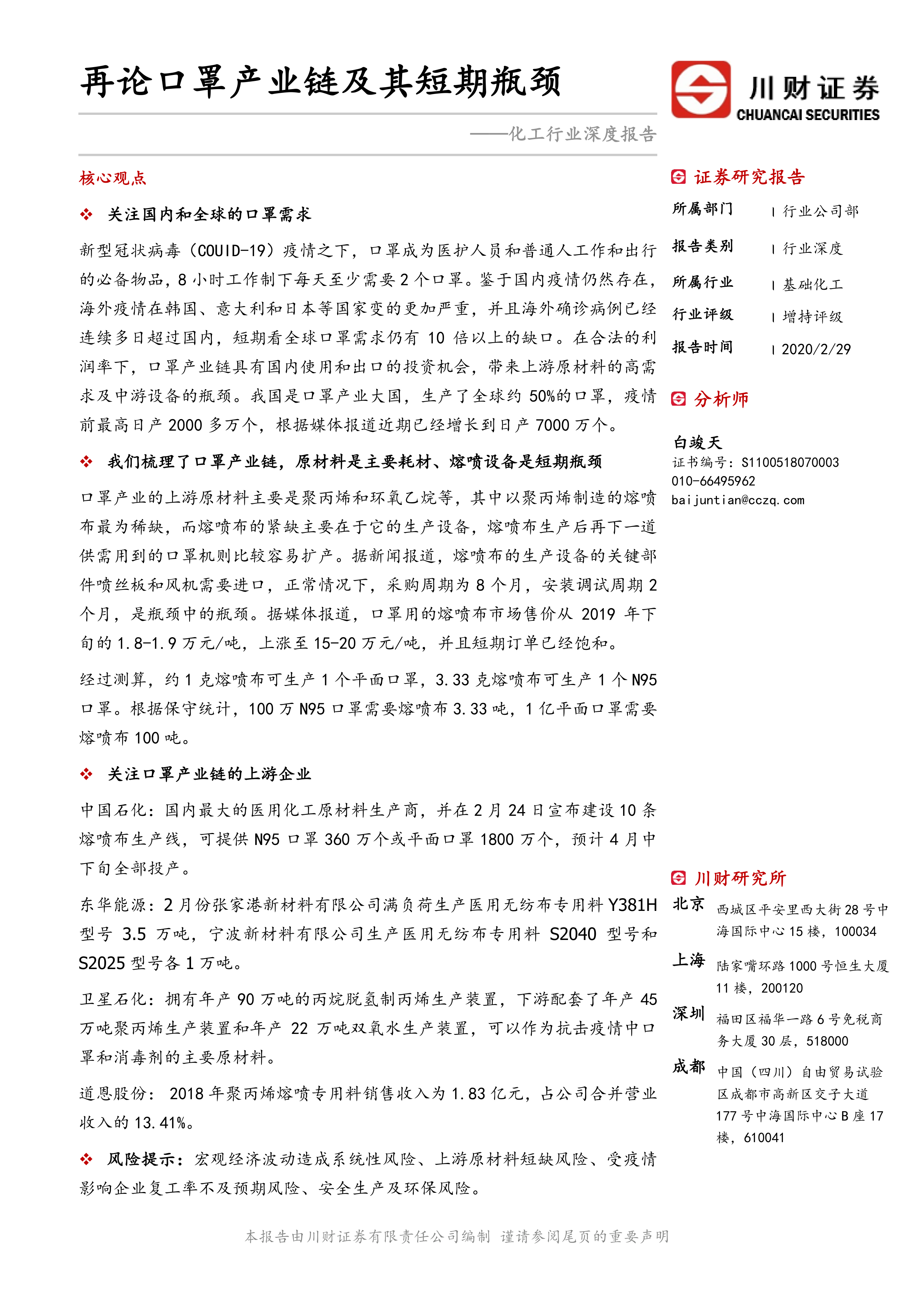 化工行业深度报告:再论口罩产业链及其短期瓶颈