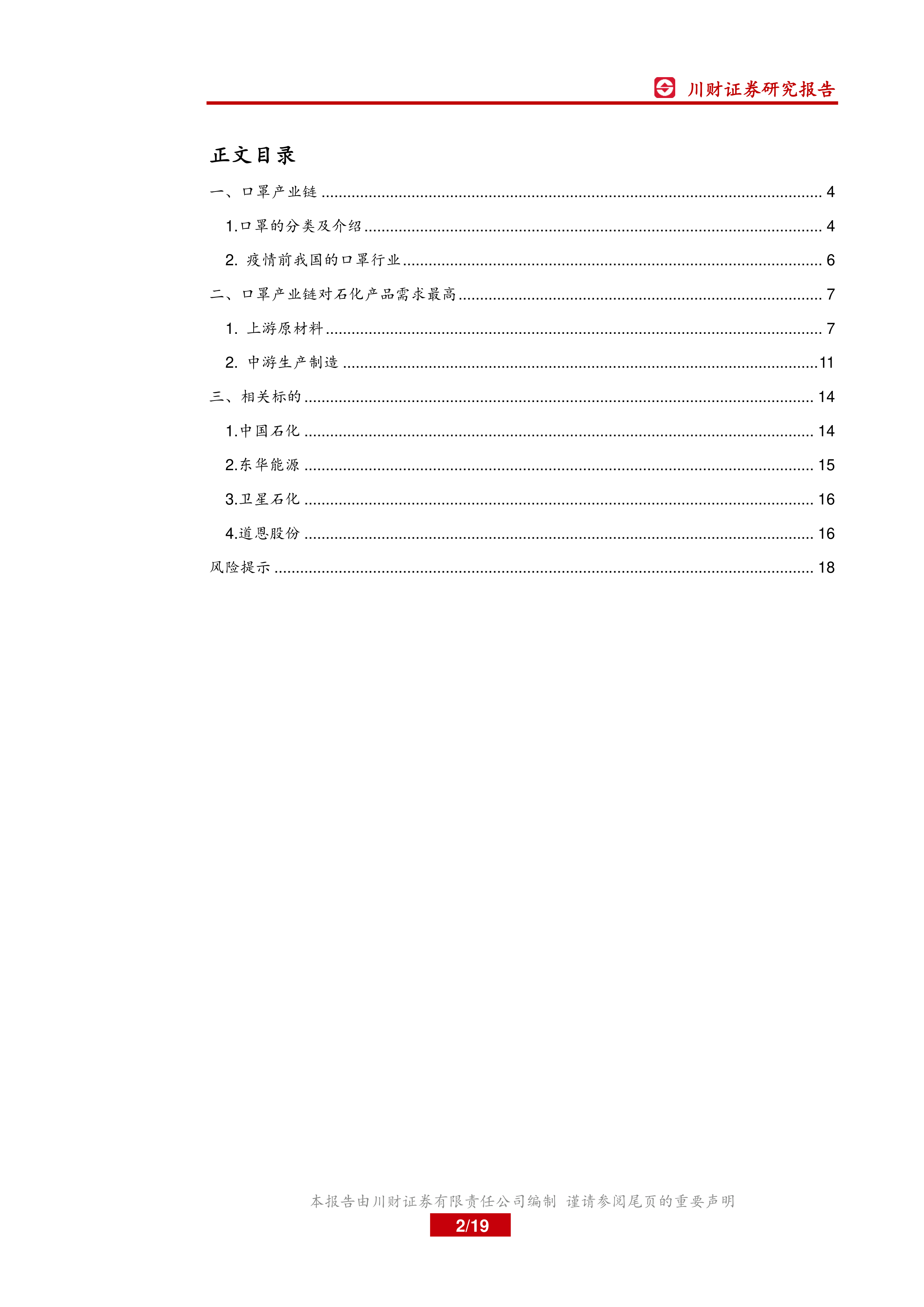 报告对中国石化、东华能源、卫星石化和道恩股份四家与口罩产业链相关的上市公司进行了分析,分别介绍了其在口罩产业链中的地位、生产能力以及应对疫情的措施。报告还列出了这些公司的估值数据,为投资者提供参考。