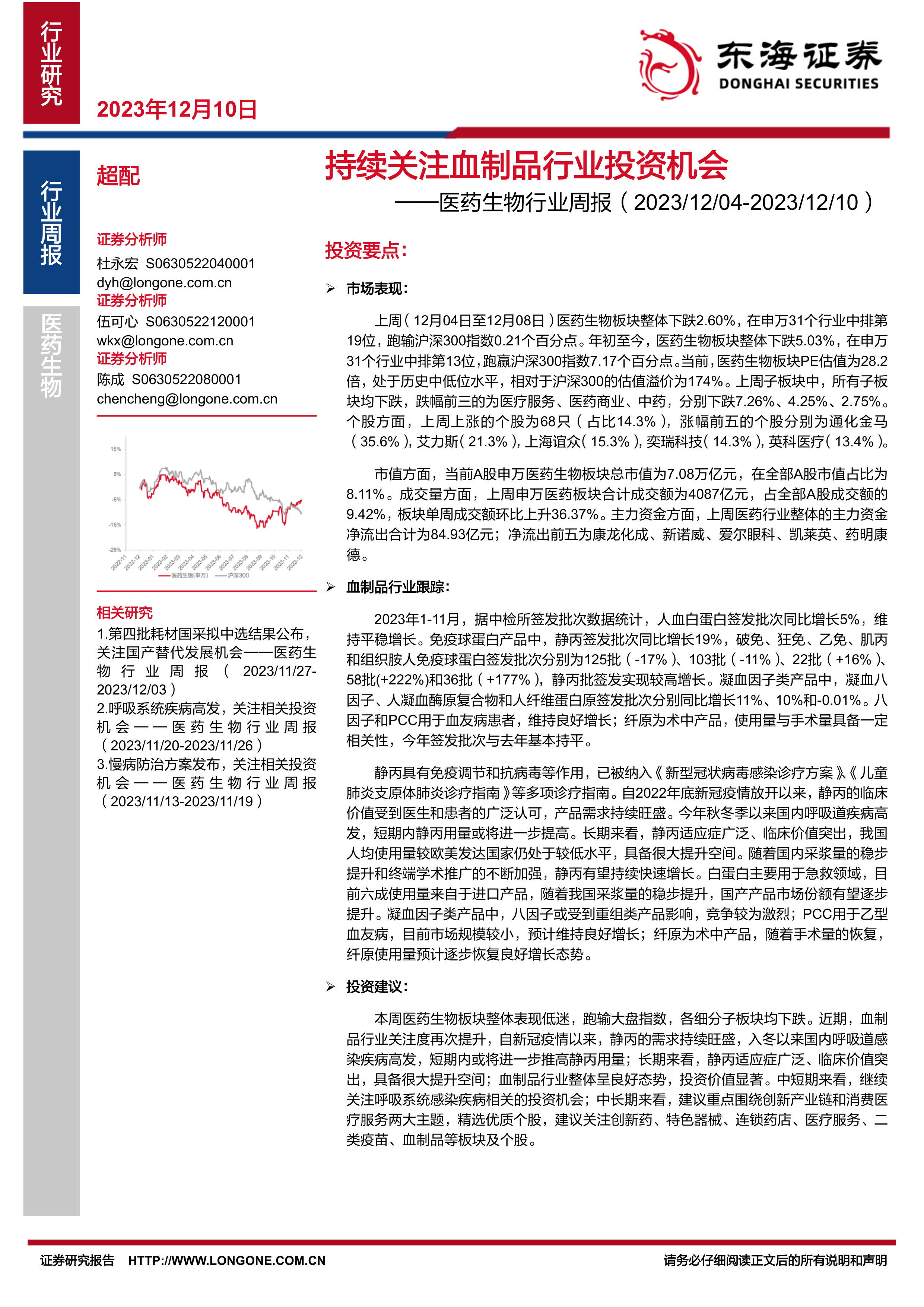 本周医药生物板块整体表现低迷,跑输大盘指数,各细分子板块均下跌。近期,血制品行业关注度再次提升,自新冠疫情以来,静丙的需求持续旺盛,入冬以来国内呼吸道感染疾病高发,短期内或将进一步推高静丙用量;长期来看,静丙适应症广泛、临床价值突出,具备很大提升空间;血制品行业整体呈良好态势,投资价值显著。中短期来看,继续关注呼吸系统感染疾病相关的投资机会;中长期来看,建议重点围绕创新产业链和消费医疗服务两大主题,精选优质个股,建议关注创新药、特色器械、连锁药店、医疗服务、二类疫苗、血制品等板块及个股。