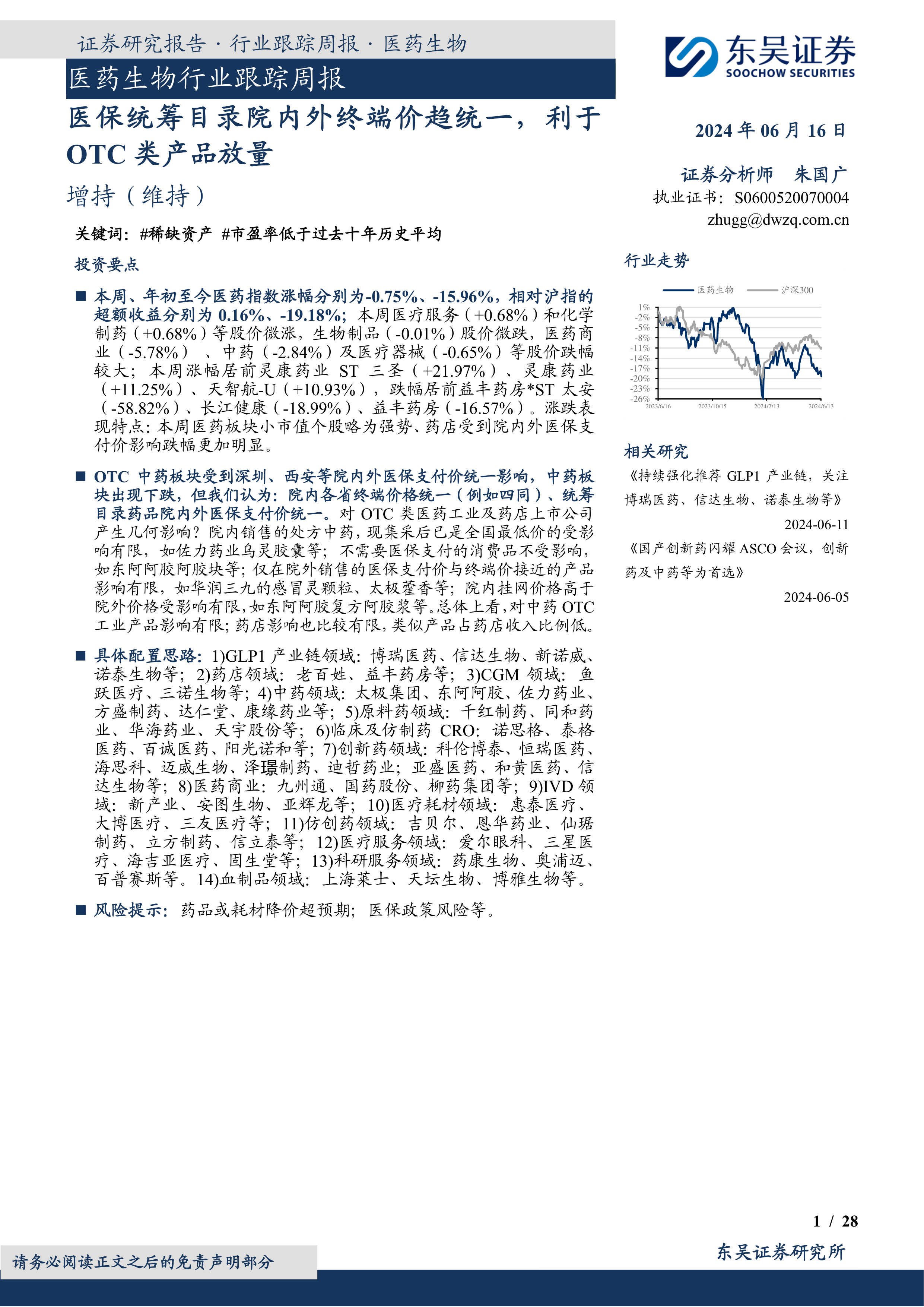 具体配置思路:1)GLP1产业链领域:博瑞医药、信达生物、新诺威、诺泰生物等;2)药店领域:老百姓、益丰药房等;3)CGM领域:鱼跃医疗、三诺生物等;4)中药领域:太极集团、东阿阿胶、佐力药业、方盛制药、达仁堂、康缘药业等;5)原料药领域:千红制药、同和药业、华海药业、天宇股份等;6)临床及仿制药CRO:诺思格、泰格医药、百诚医药、阳光诺和等;7)创新药领域:科伦博泰、恒瑞医药、海思科、迈威生物、泽璟制药、迪哲药业;亚盛医药、和黄医药、信达生物等;8)医药商业:九州通、国药股份、柳药集团等;9)IVD领域:新产业、安图生物、亚辉龙等;10)医疗耗材领域:惠泰医疗、大博医疗、三友医疗等;11)仿创药领域:吉贝尔、恩华药业、仙琚制药、立方制药、信立泰等;12)医疗服务领域:爱尔眼科、三星医疗、海吉亚医疗、固生堂等;13)科研服务领域:药康生物、奥浦迈、百普赛斯等。14)血制品领域:上海莱士、天坛生物、博雅生物等。