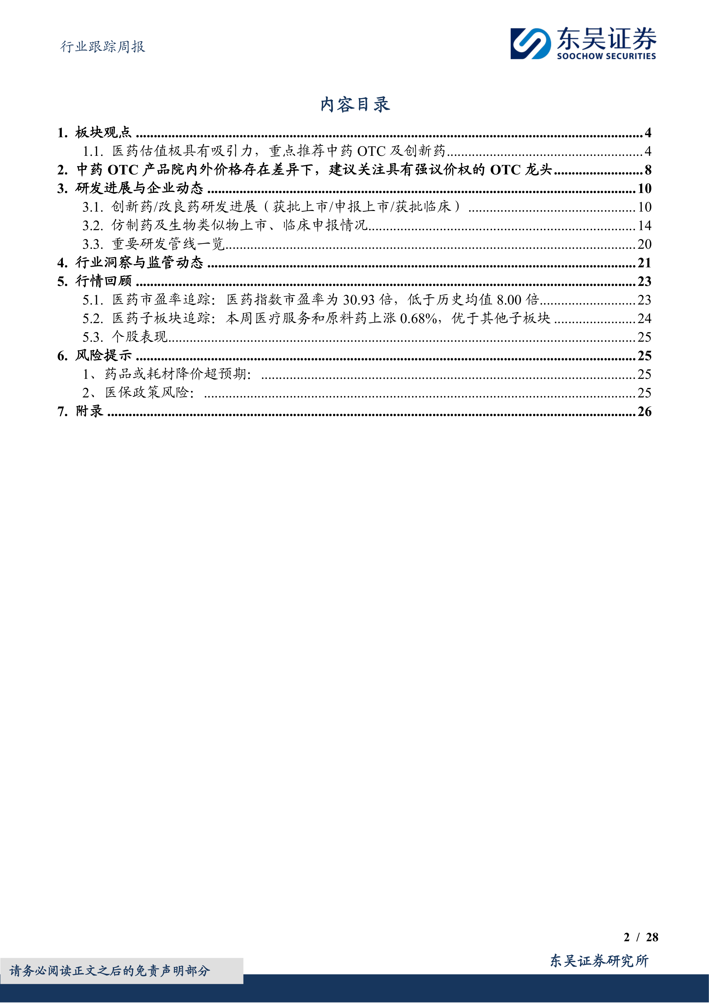 本报告基于公开数据和行业分析,对医药生物行业近期行情、医保政策影响、研发进展以及监管动态进行了全面分析。报告认为,医保统筹目录院内外终端价趋于统一对OTC类中药产品放量的影响有限,但对药店板块冲击较大。目前医药板块整体估值具有吸引力,建议投资者重点关注中药OTC及创新药领域,同时需关注药品降价和医保政策等潜在风险。 报告中提供的公司列表和投资建议仅供参考,不构成投资建议,投资者应根据自身情况进行独立判断。