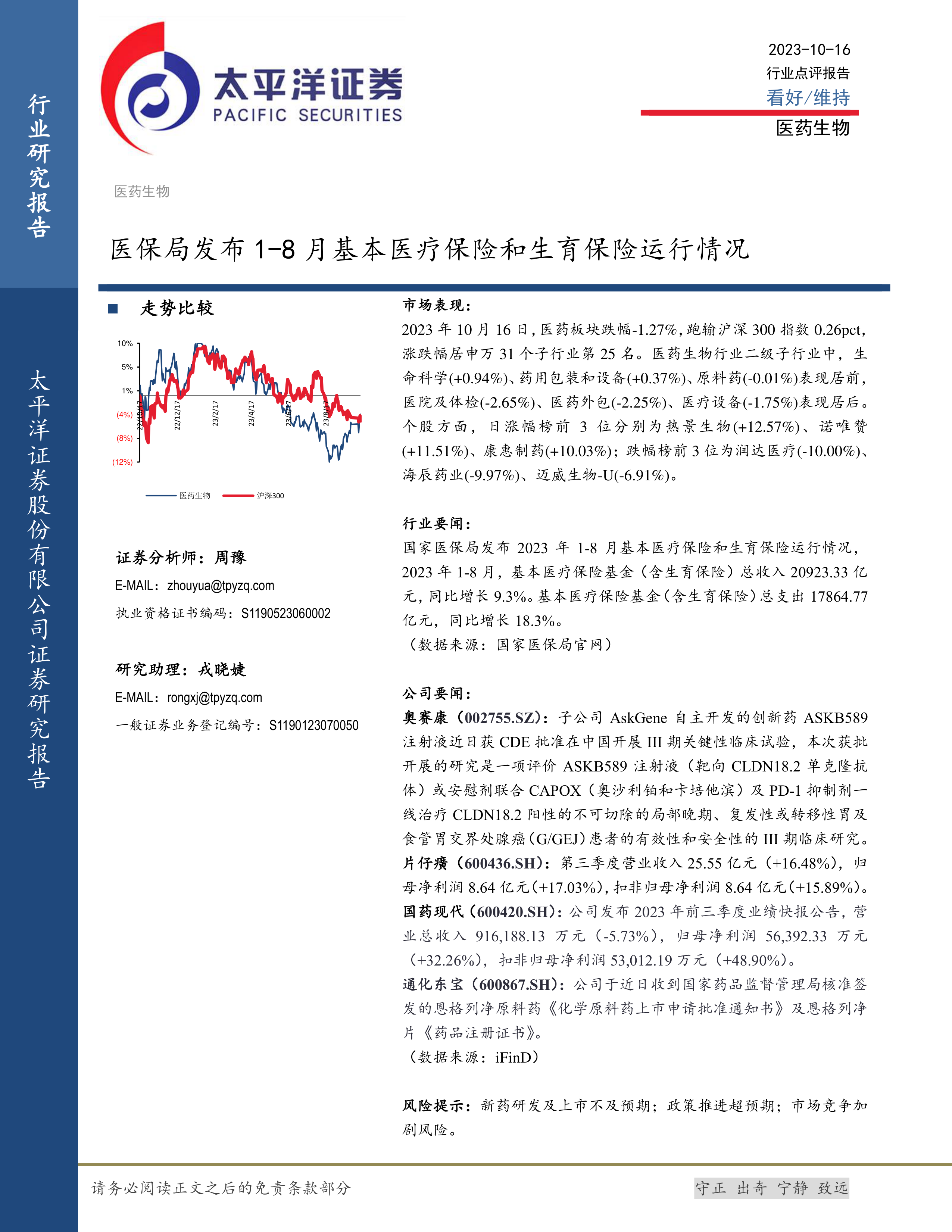 本报告的核心观点是:2023年1-8月,中国基本医疗保险基金收入增长放缓,支出增长加快,医药板块整体表现弱于大盘,但部分细分领域和个股表现突出。 需要关注医保基金的持续增长能力以及医药行业政策变化对市场的影响。