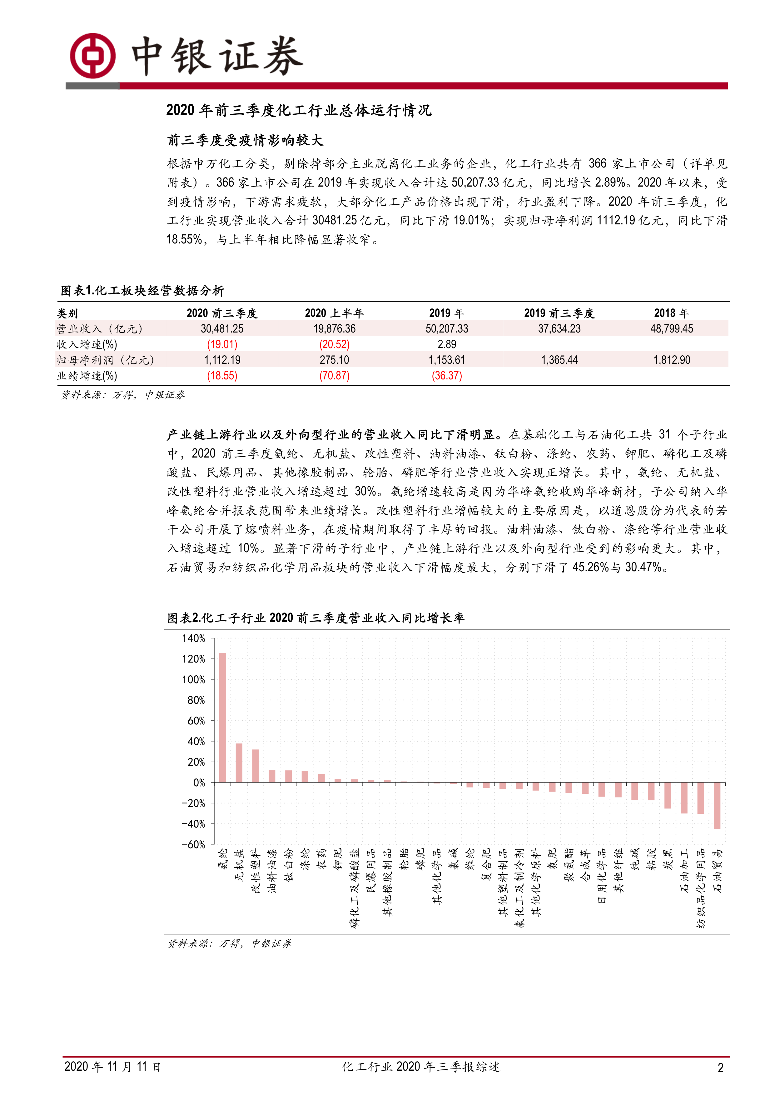 报告首先分析了2020年前三季度化工行业的总体运行情况。数据显示,受疫情影响,下游需求疲软,大部分化工产品价格下滑,行业盈利下降。但三季度国内下游复苏,海外需求回暖,部分海外订单回流,使得行业需求转好,业绩环比改善。