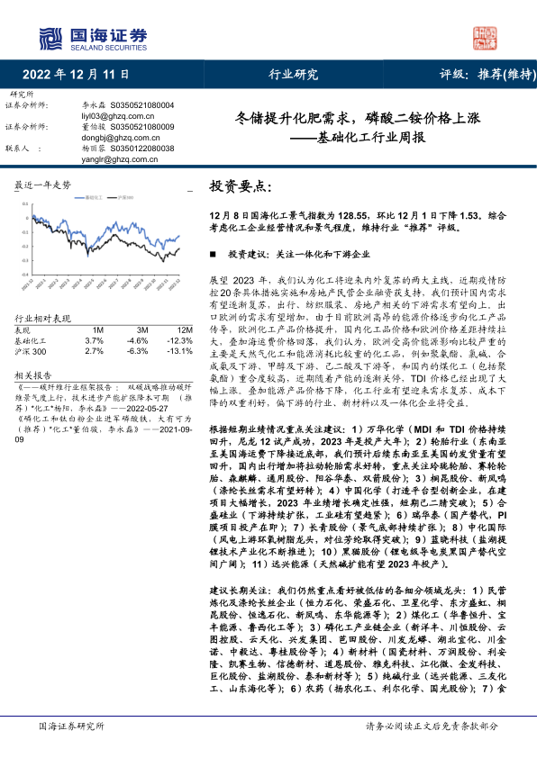 本报告的核心观点是:尽管12月8日国海化工景气指数环比下降,但综合考虑化工企业经营情况和景气程度,维持化工行业“推荐”评级。2023年,国内外需求有望复苏,化工行业将迎来需求复苏、成本下降的双重利好,下游行业、新材料以及一体化企业将受益。报告重点关注万华化学、玲珑轮胎等十家公司,并建议长期关注民营炼化、煤化工、磷化工等领域的龙头企业。