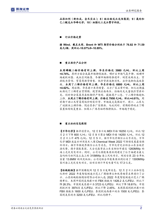 报告首先跟踪了国海化工景气指数,并对万华化学、玲珑轮胎、赛轮轮胎、森麒麟、双箭股份、华峰化学、粤桂股份、扬农化工、利尔化学、广信股份、长青股份、远兴能源、山东海化、利安隆、山东赫达、金发科技、道恩股份、江化微、华恒生物、中化国际、楚江新材、阳谷华泰、国瓷材料、中毅达、三友化工、华鲁恒升、国光股份、三棵树、雅克科技、新洋丰、云图控股、齐翔腾达、宝丰能源、中国化学、瑞华泰、恒力石化、荣盛石化、东方盛虹、恒逸石化、桐昆股份、新凤鸣、新和成、卫星化学、龙佰集团、赞宇科技、金禾实业和蓝晓科技等公司的近期动态,包括产品价格走势、公司公告、行业新闻等。 并提供了部分公司的图表数据,例如聚合MDI价格及库存曲线、中国出口海运集装箱FBX指数、维生素A价格等。