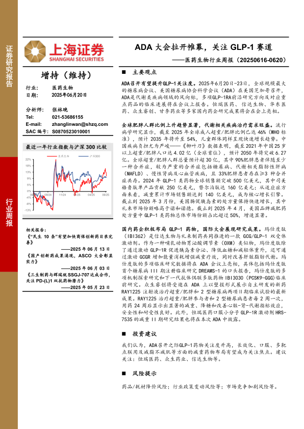 ADA会议的召开将进一步提升GLP-1药物的关注度,长效化、口服、多靶点联用及减脂不减肌等方面的减重药物布局将成为关注焦点。报告建议关注恒瑞医药、众生药业、信达生物等公司。