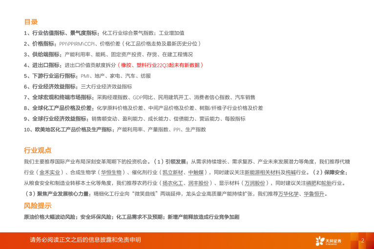 报告分析了PMI、地产、家电、汽车和纺服等下游行业的运行指标,以评估下游需求对化工行业的影响。