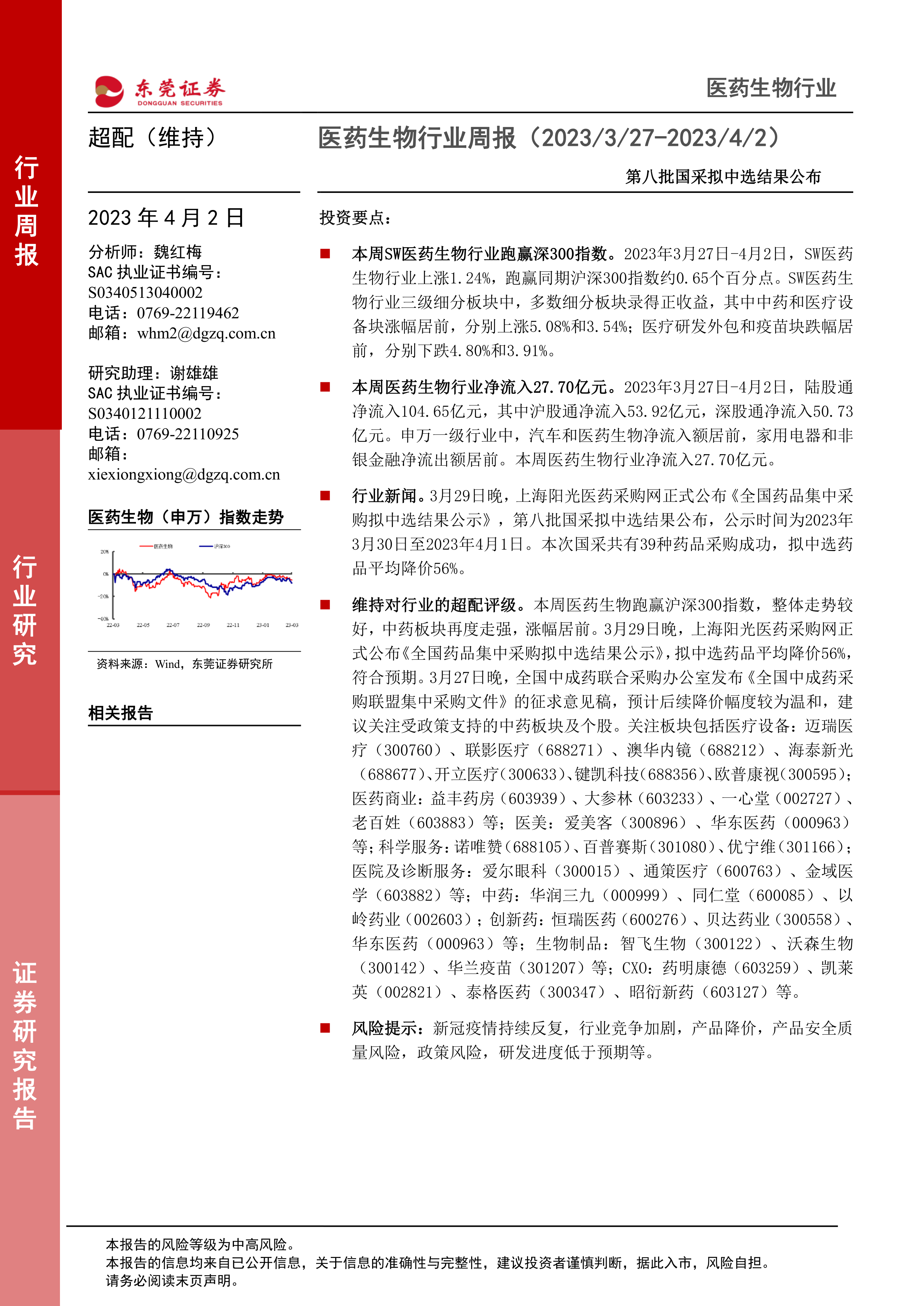 本报告的核心观点是:本周SW医药生物行业表现强劲,跑赢沪深300指数,整体走势良好。中药板块涨幅居前,第八批国家药品集中采购(国采)结果公布,平均降价56%,符合预期。尽管存在疫情反复、行业竞争加剧等风险,但考虑到估值处于相对低位,以及中药板块受政策支持,维持对医药生物行业的超配评级。
